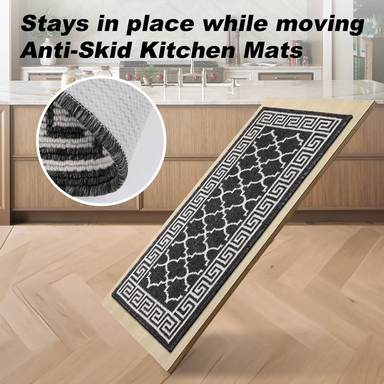 • Made of high-quality polypropylene fabric, sturdy, eco-friendly, and odorless. Excellent stain resistance protects floors from oil, moisture, sauces, or food particles. A great way to keep your kitchen clean and tidy.