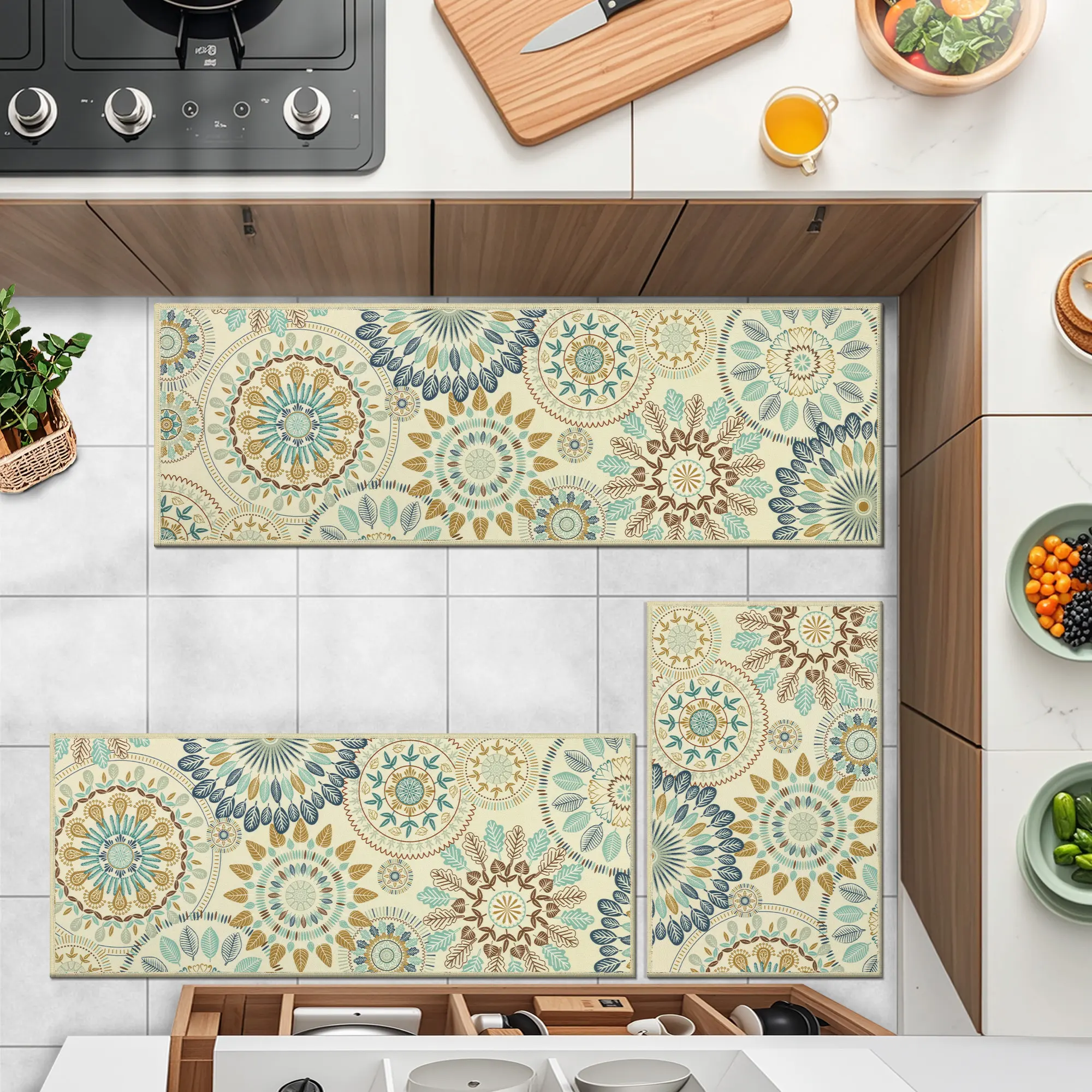 Beautiful rugs with great quality! Fits perfect infront of my sink, stove and sliding glass door.