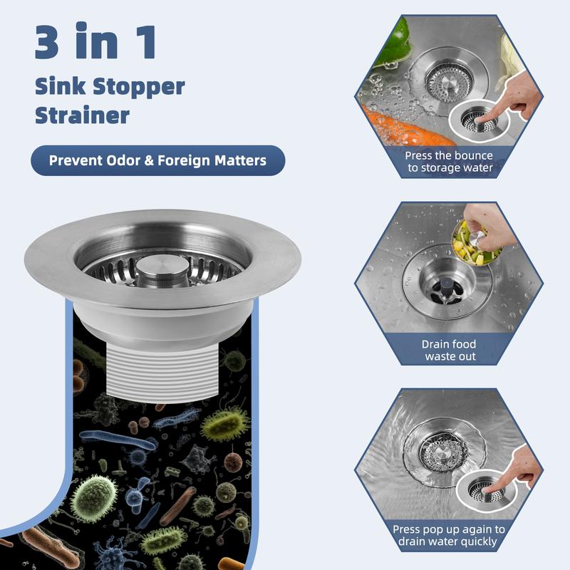 LEAKLESS SINK DRAIN STOPPER: By pressing its spring-loaded handle, you can effortlessly trap water for zero leakage assurance, convenient for kitchen food or dish washing. 3-in-1 sink drainer aims to alleviate your everyday kitchen struggles.