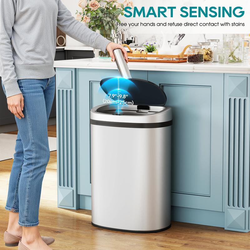 Our trash can features an oval body and sloping lid for effortless waste disposal. Made of brushed stainless steel with a wire drawing surface, it's durable and stylish. Perfect for any room in your home or office, it offers a touch-free design for convenience.