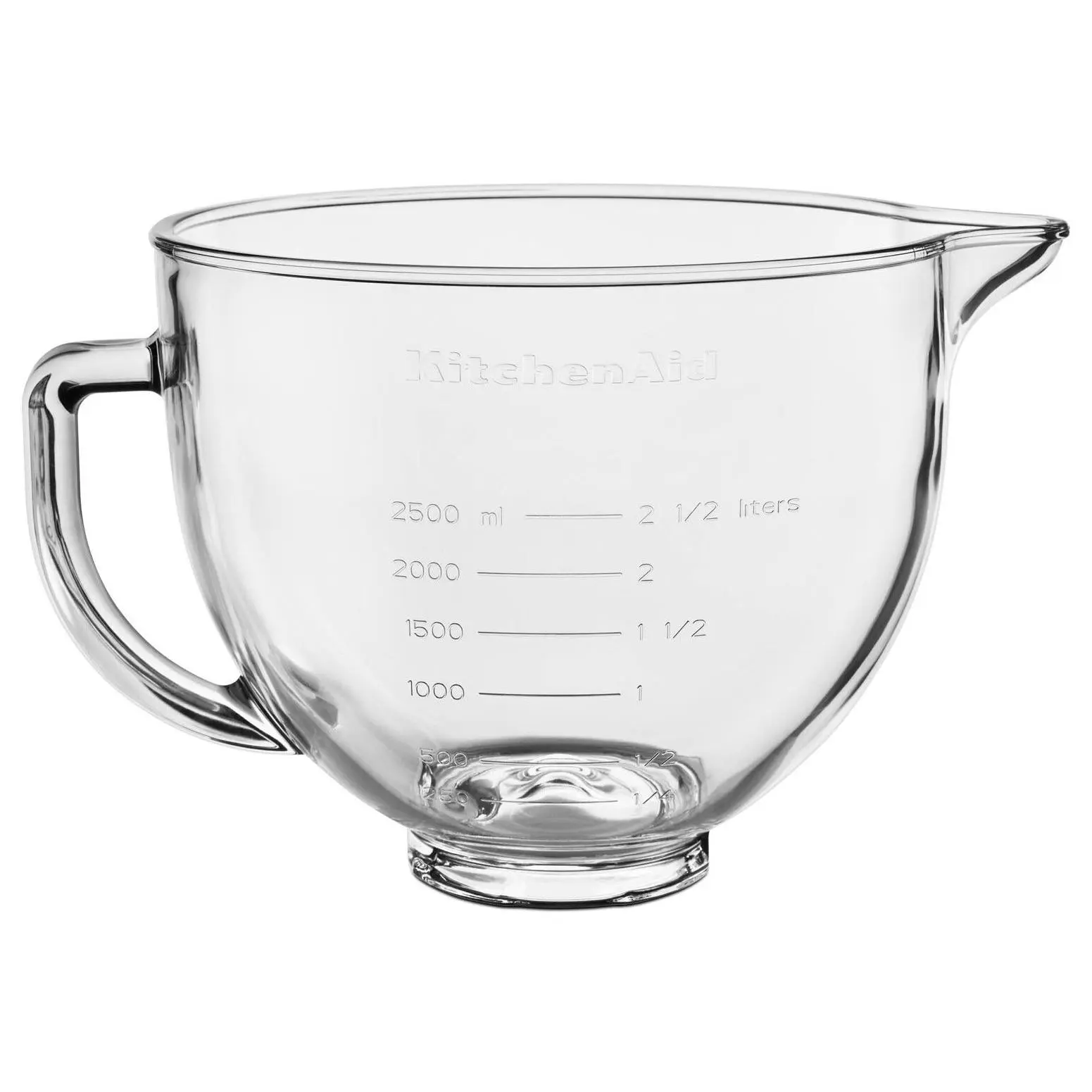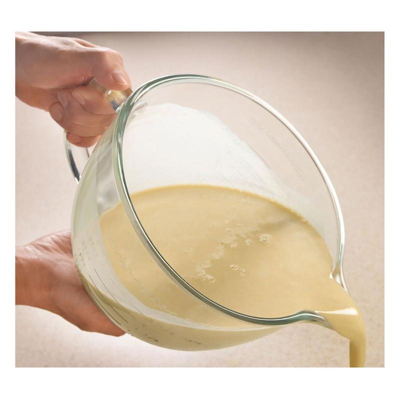 Elevate your baking and mixing experience with the KitchenAid 5-Qt Clear Glass Bowl with Lid. This accessory, designed for all 4.5- and 5-qt tilt-head stand mixers, not only enhances visibility with its clear construction but also adds precision with graduated measure lines. Its drip-proof spout and snug-fitting lid make both mixing and storing a breeze. From KitchenAid.