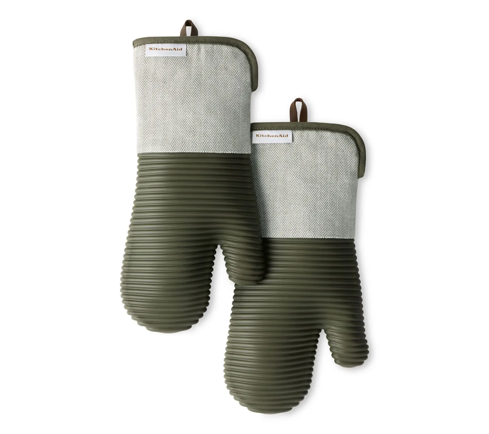 Handle hot cookware with confidence and style using these oven mitts, crafted with KitchenAid's signature Evergreen design. The ribbed silicone offers a more secure grip. The brown leather hanging loops add a touch of elegance and make storage a breeze. From KitchenAid.