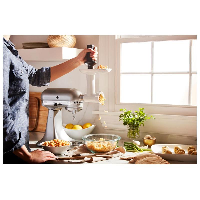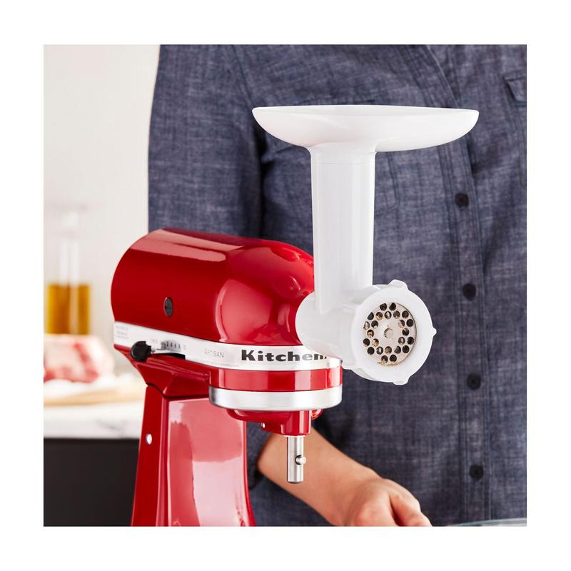 Transform your stand mixer into a versatile food grinder with the KitchenAid Food Grinder Attachment. It's designed to easily connect to the power hub of any KitchenAid stand mixer, allowing you to grind fresh or cooked meats, fruits, vegetables, dry bread, and even hard cheeses with ease. This attachment is not only easy to assemble but also comes with fine and coarse grinding plates for varied textures, making it a perfect companion for creating gourmet meals at home. From KitchenAid.