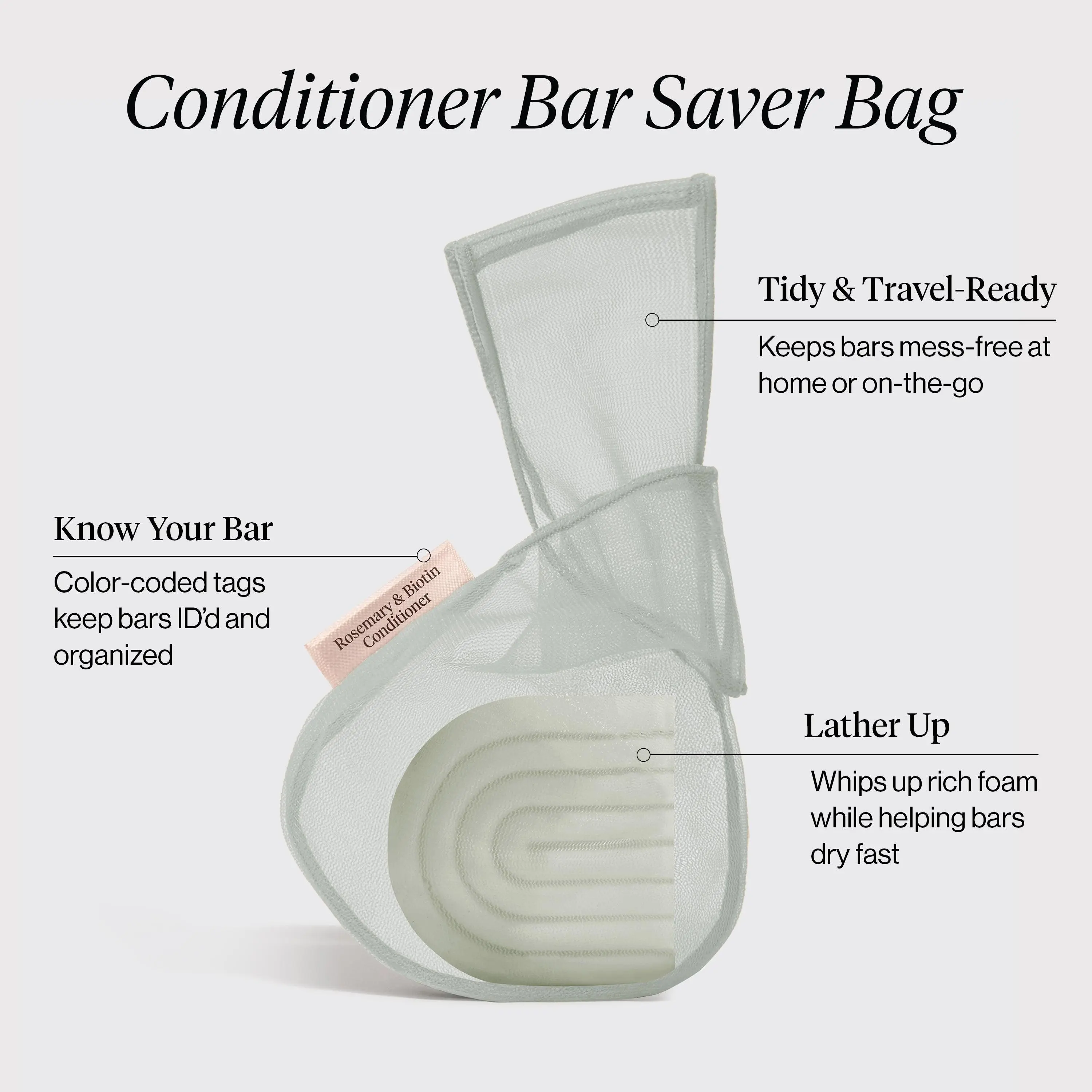 ·Mesh saver bags keep your bars clean, dry, and slip-free, extending their life