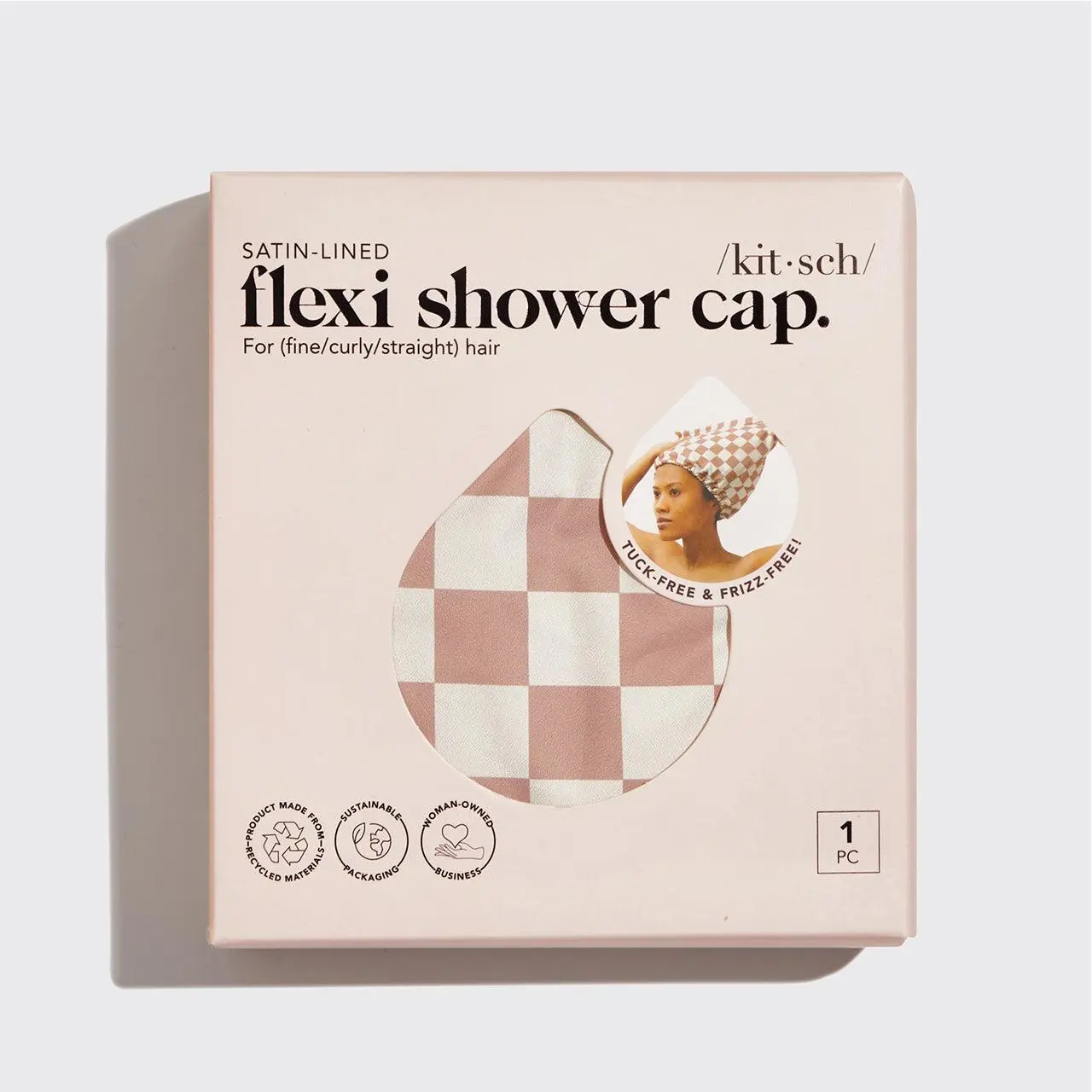 💗 1X Satin Lined Flexi Shower Cap - Terracotta Checker