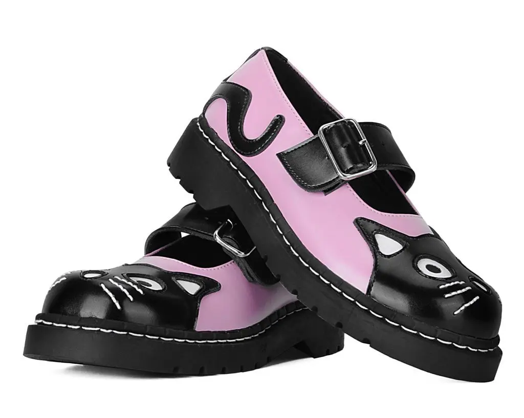 The Original T.U.K. Kitty Mary Jane.  Black and Pink Leather, with White Details, a Silver Metal Buckle, and a 1 1/2 inch Heel.