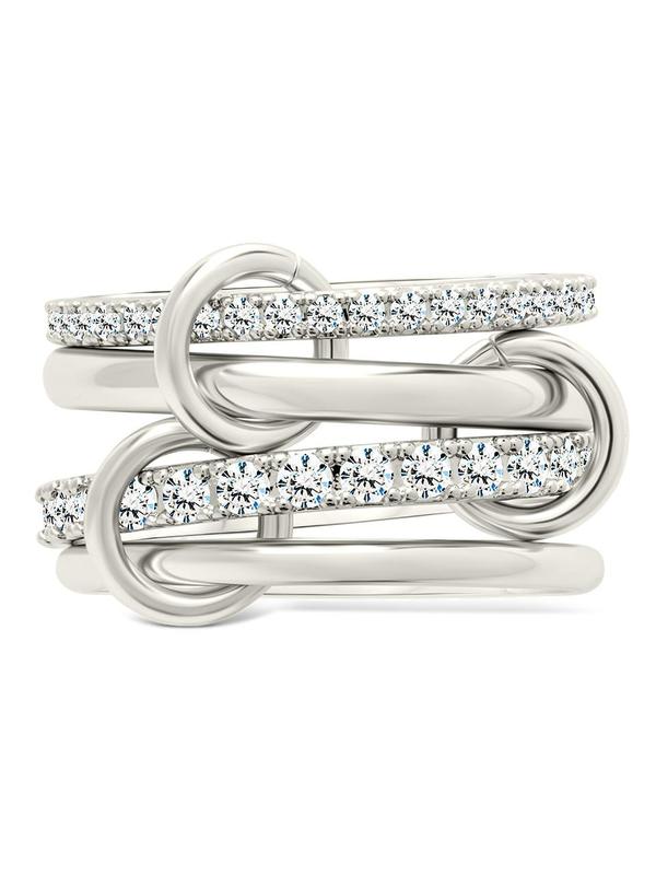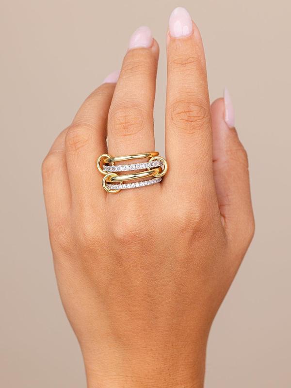 Linked up and locked in. This double-stacked ring blends pavé sparkle with oversized gold links—sculptural, statement-making, and unapologetically extra. Wear it solo or let it anchor your stack.