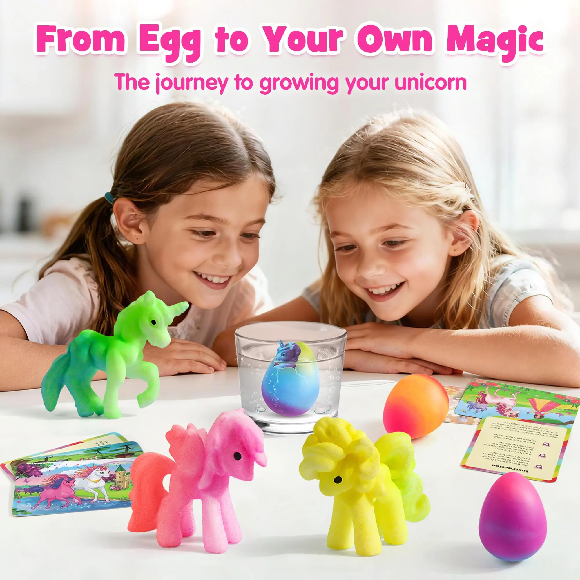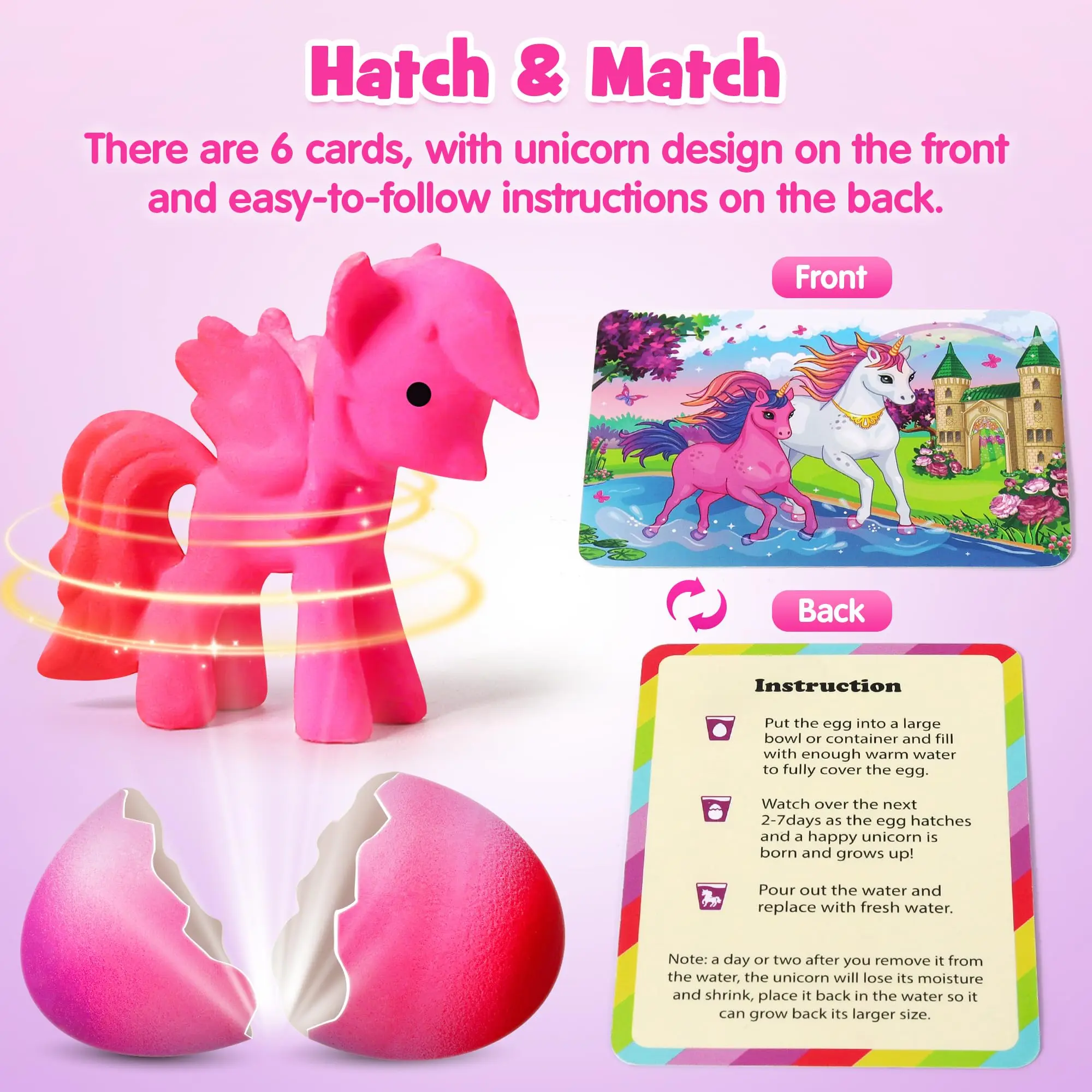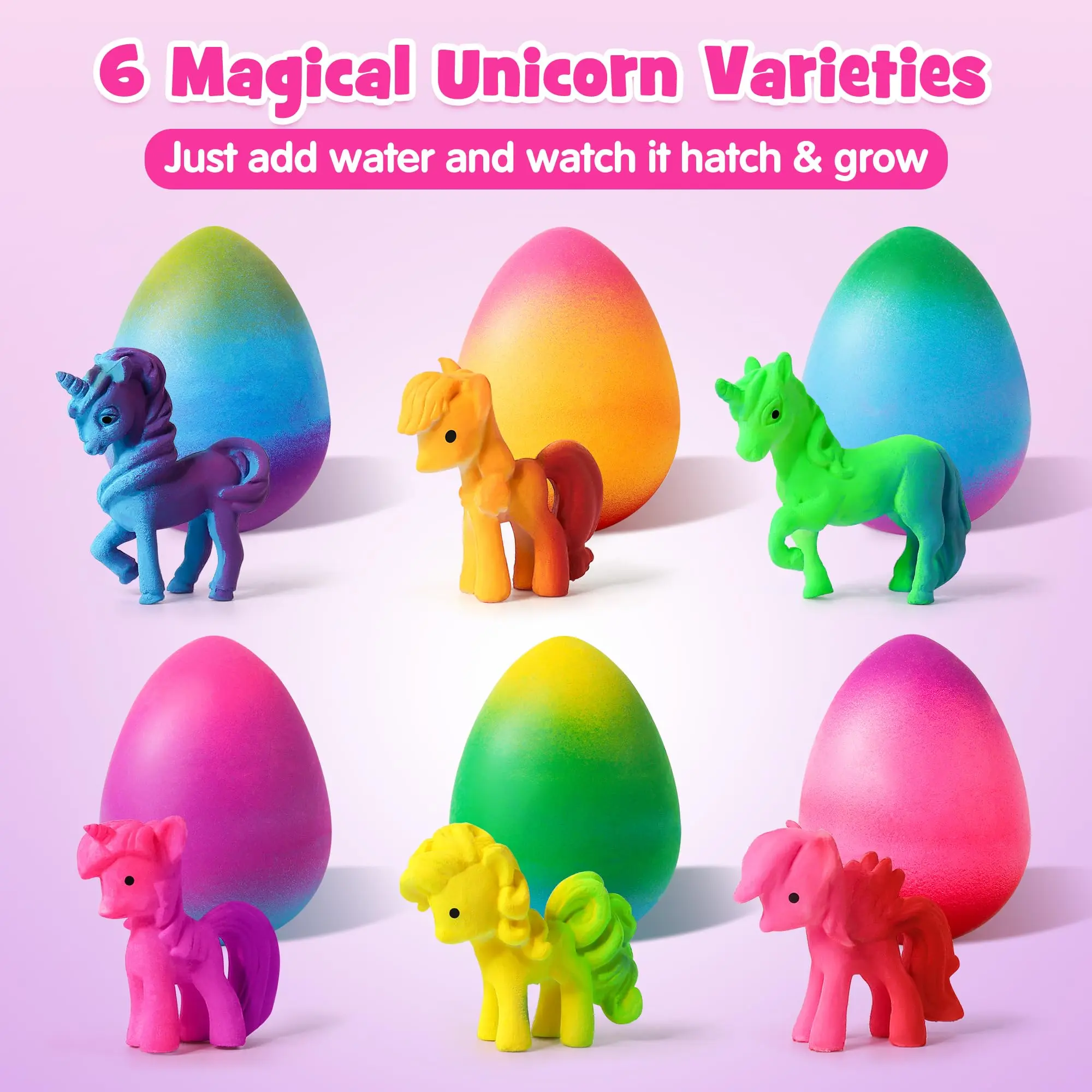 ·MAGICAL UNICORN HATCHING: Experience the enchantment of watching a unique unicorn hatch right before your eyes from a colorful egg! Just submerge the egg in water and witness the magical process.
