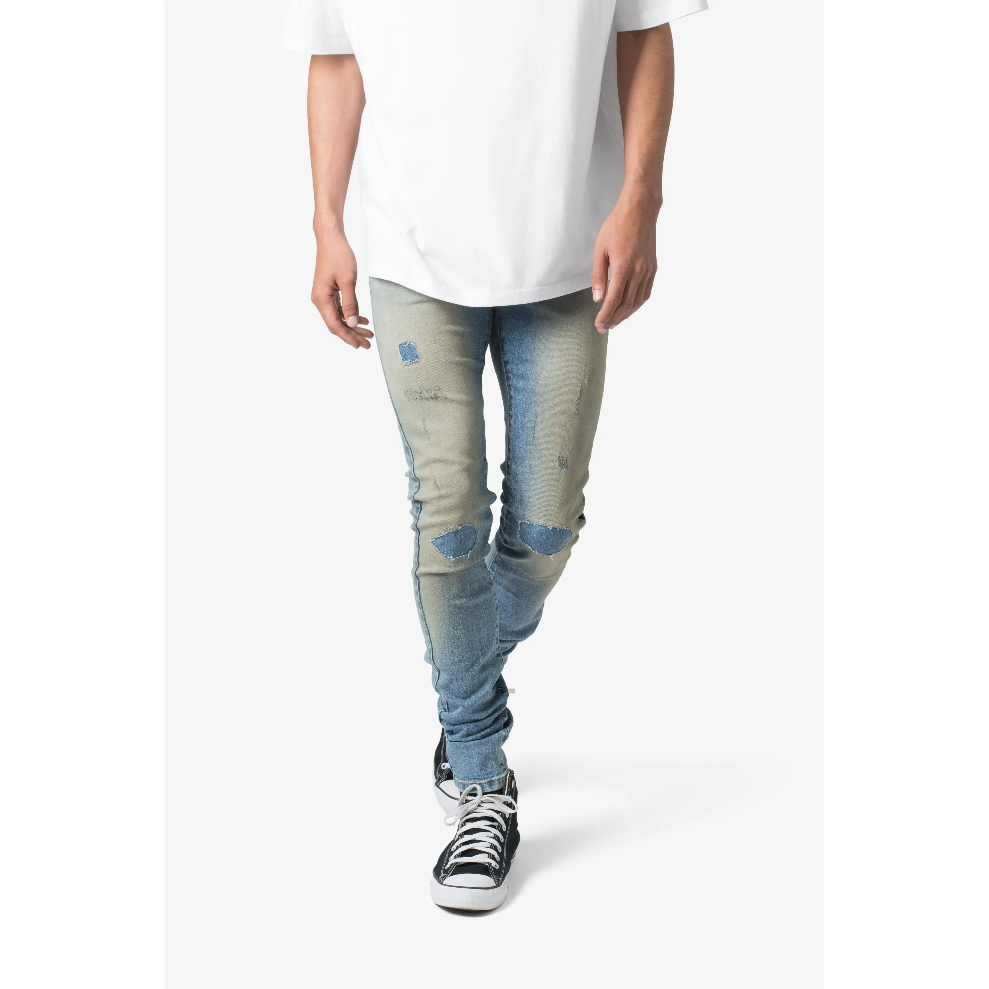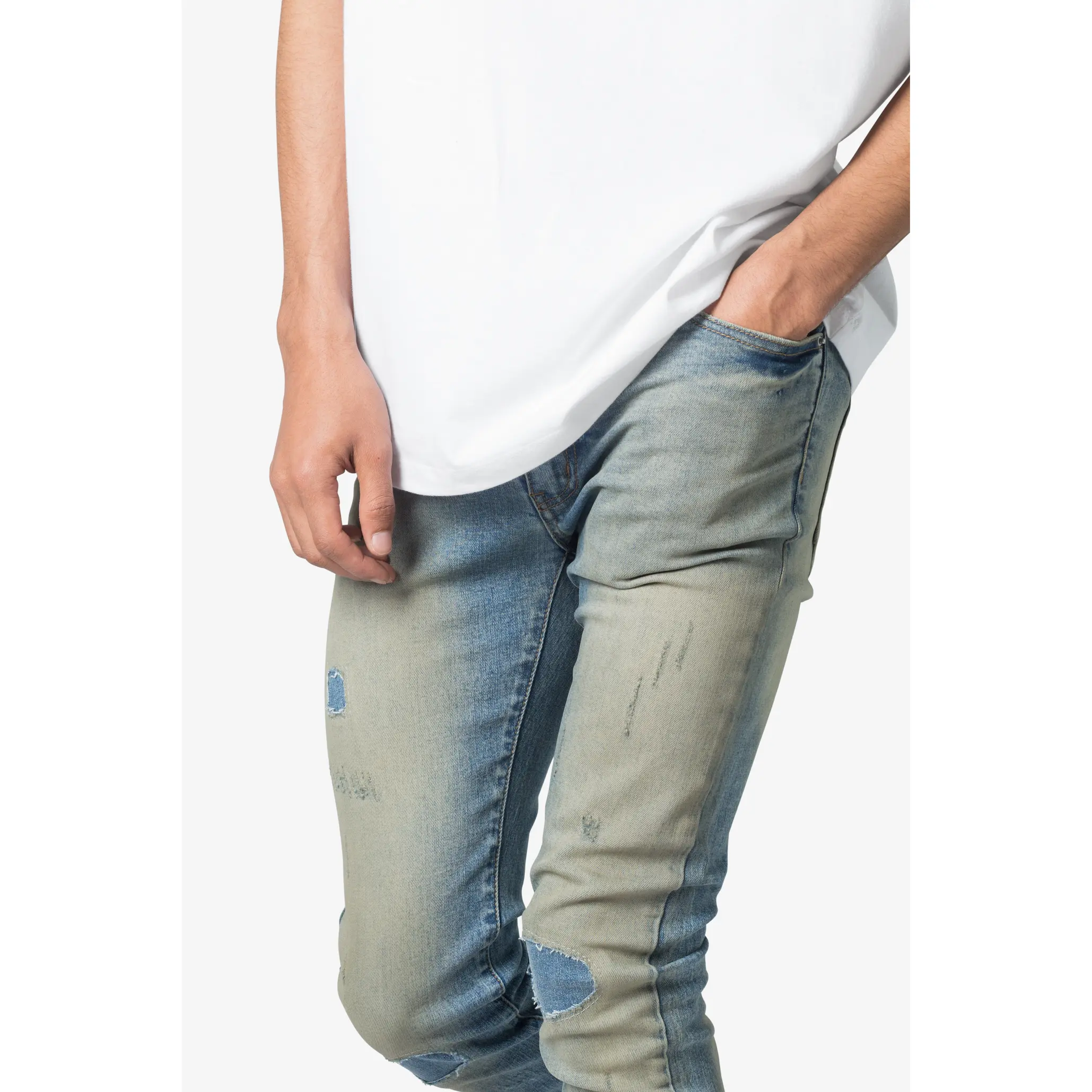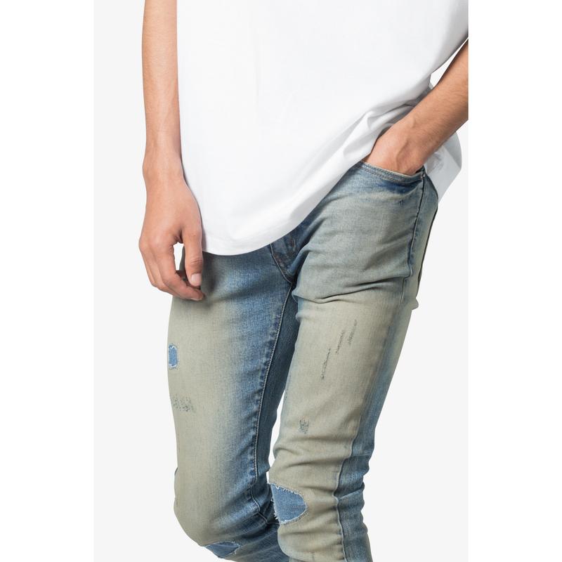 the X651 Distressed Circle Knee Denim is designed with our new X fit which is skinny throughout with an extended inseam for stacking, and features a medium wash with a vintage tint wash, and finished with distressing throughout with repairs.