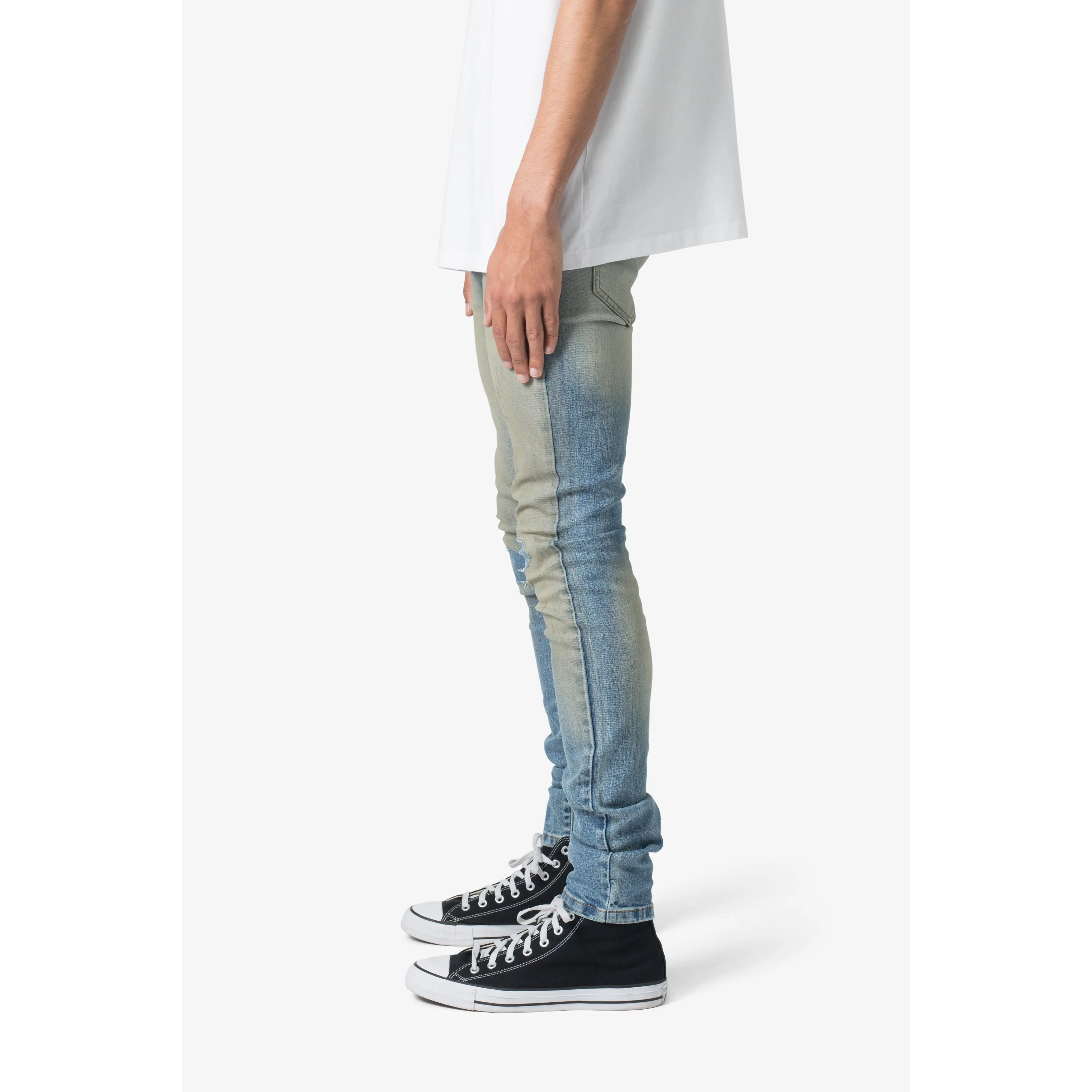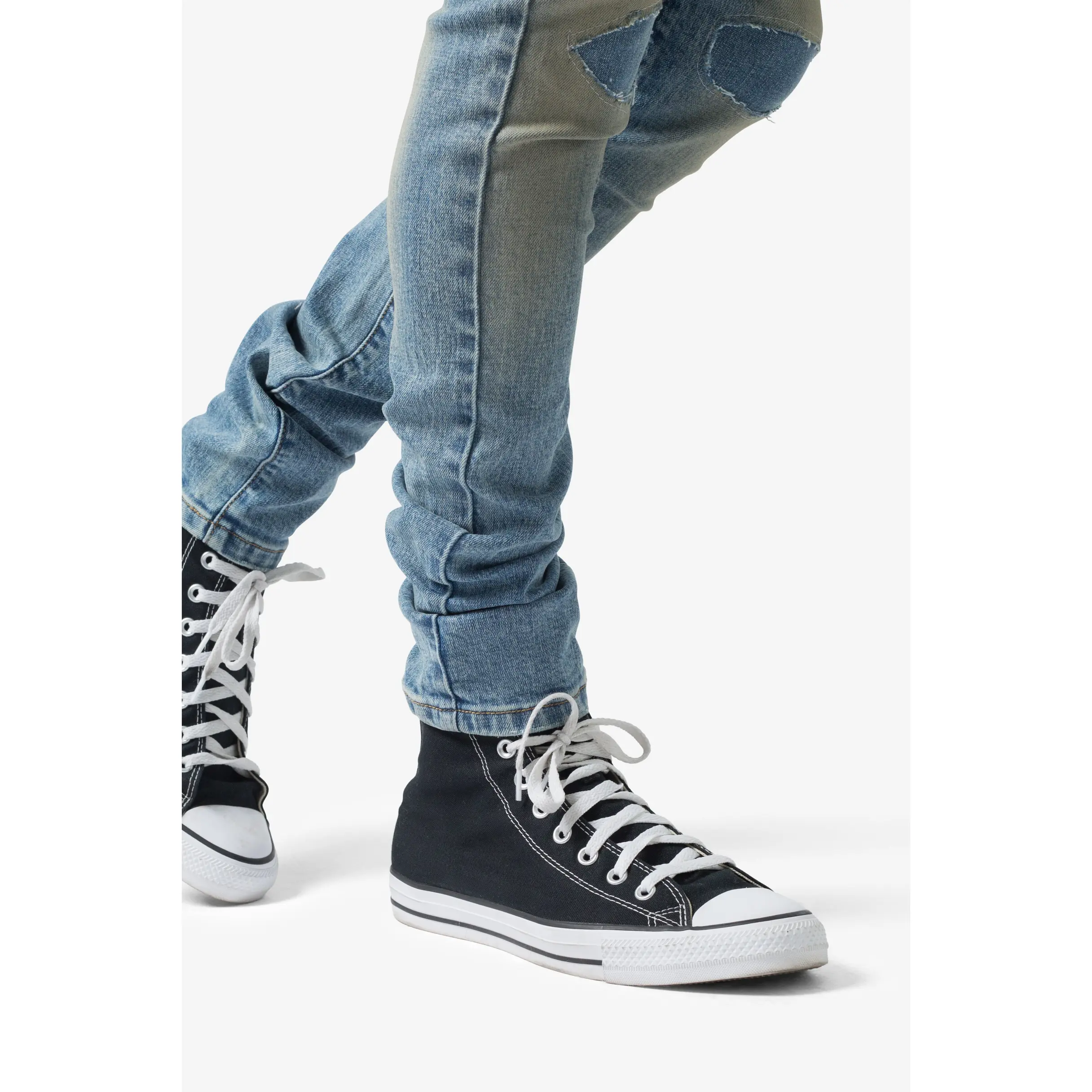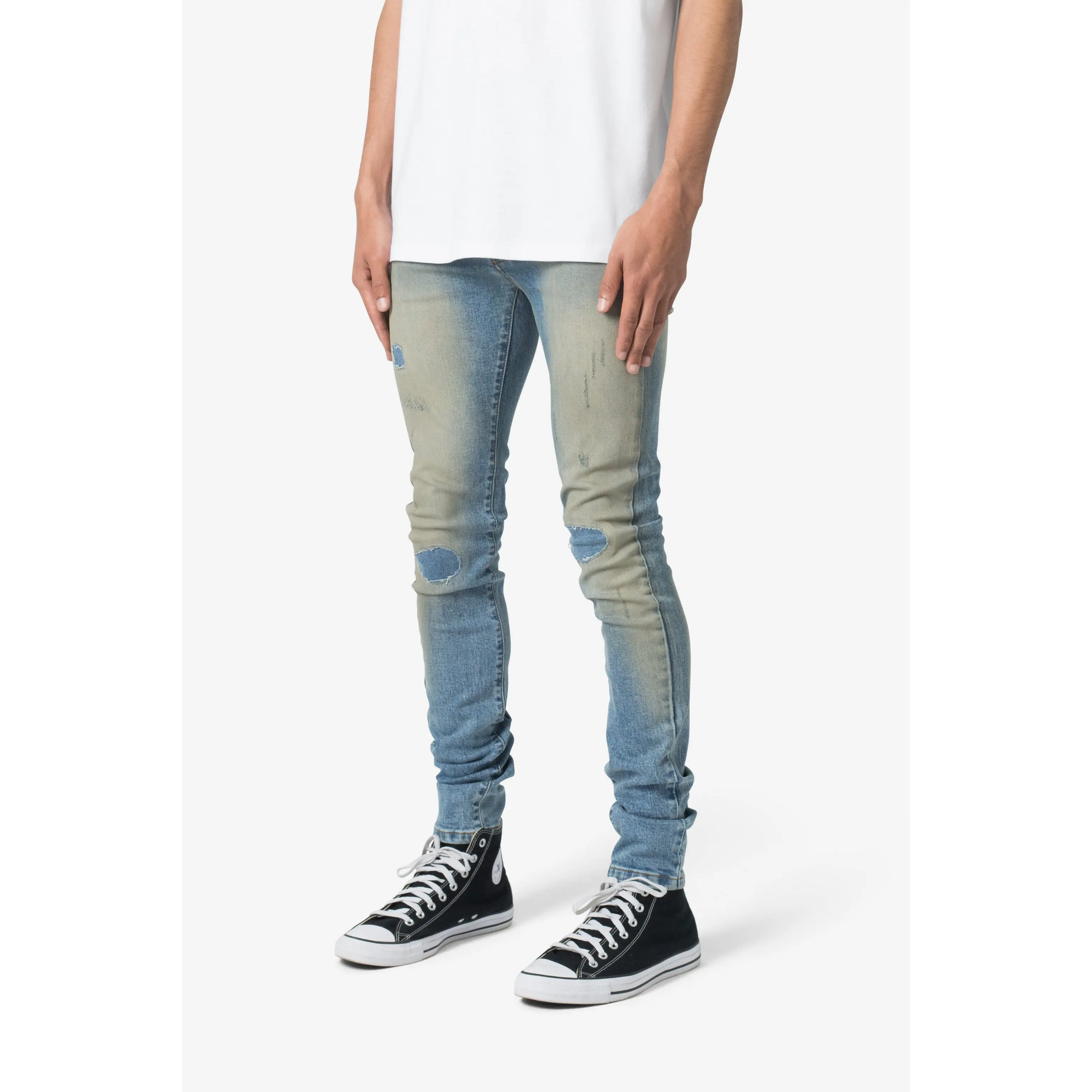 the X651 Distressed Circle Knee Denim is designed with our new X fit which is skinny throughout with an extended inseam for stacking, and features a medium wash with a vintage tint wash, and finished with distressing throughout with repairs.