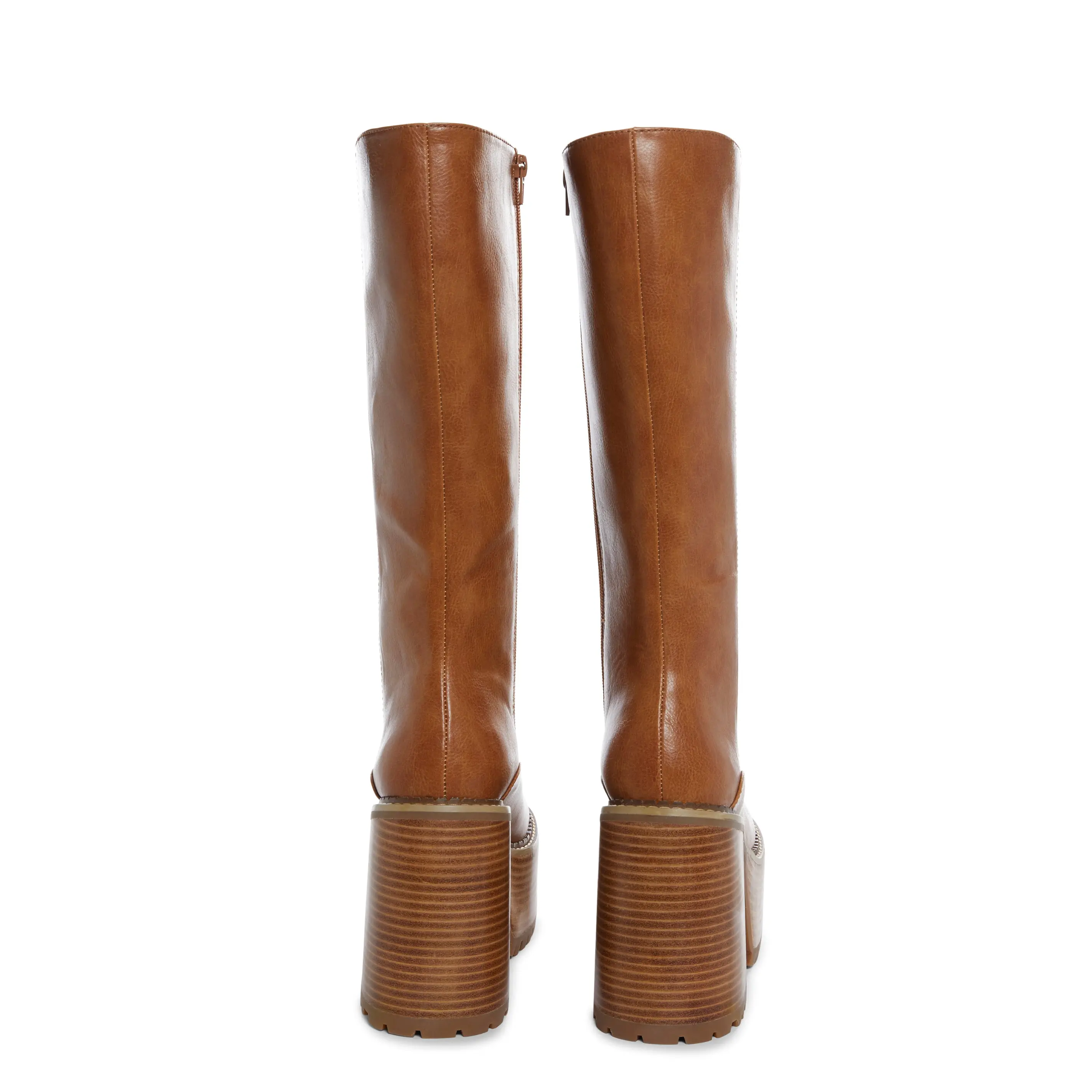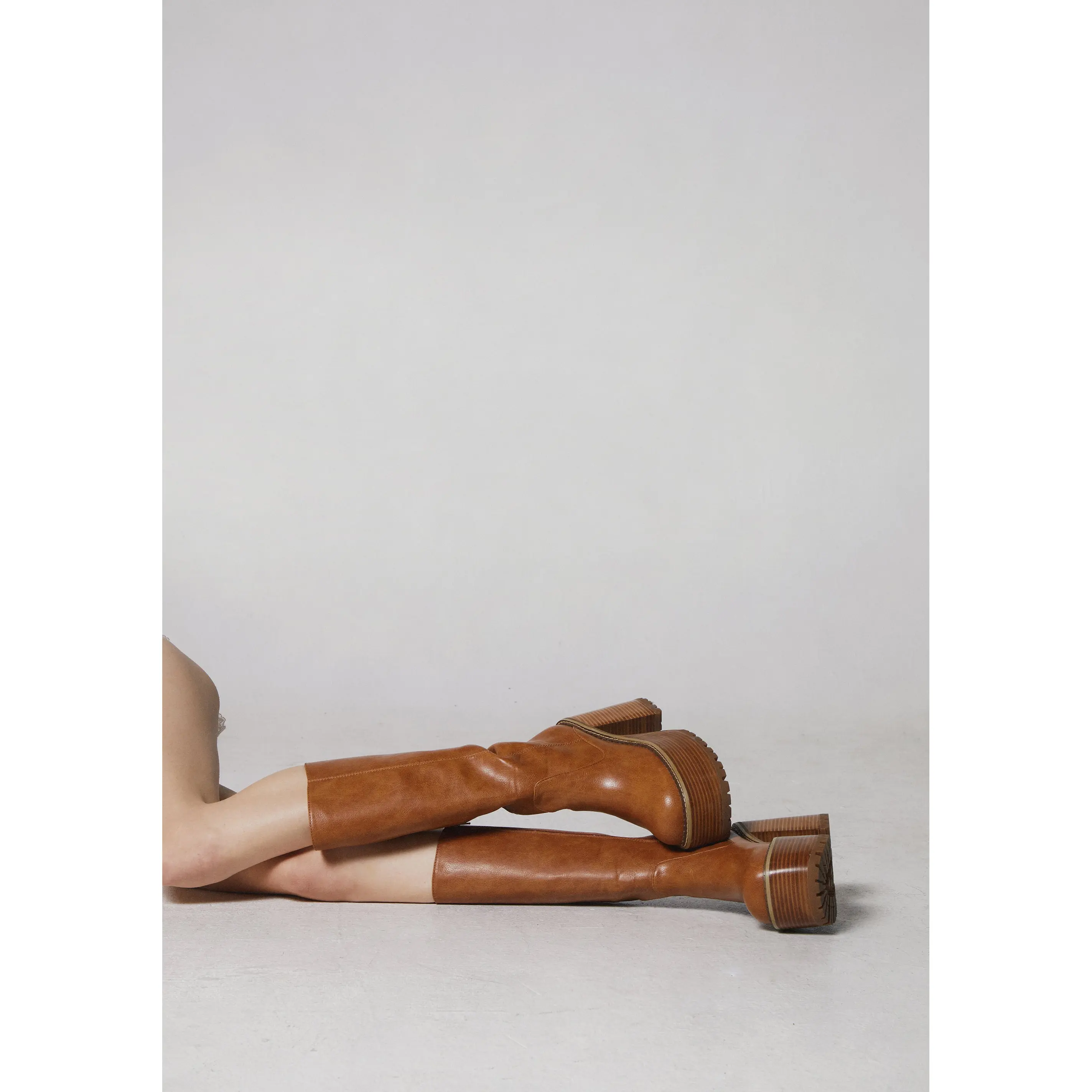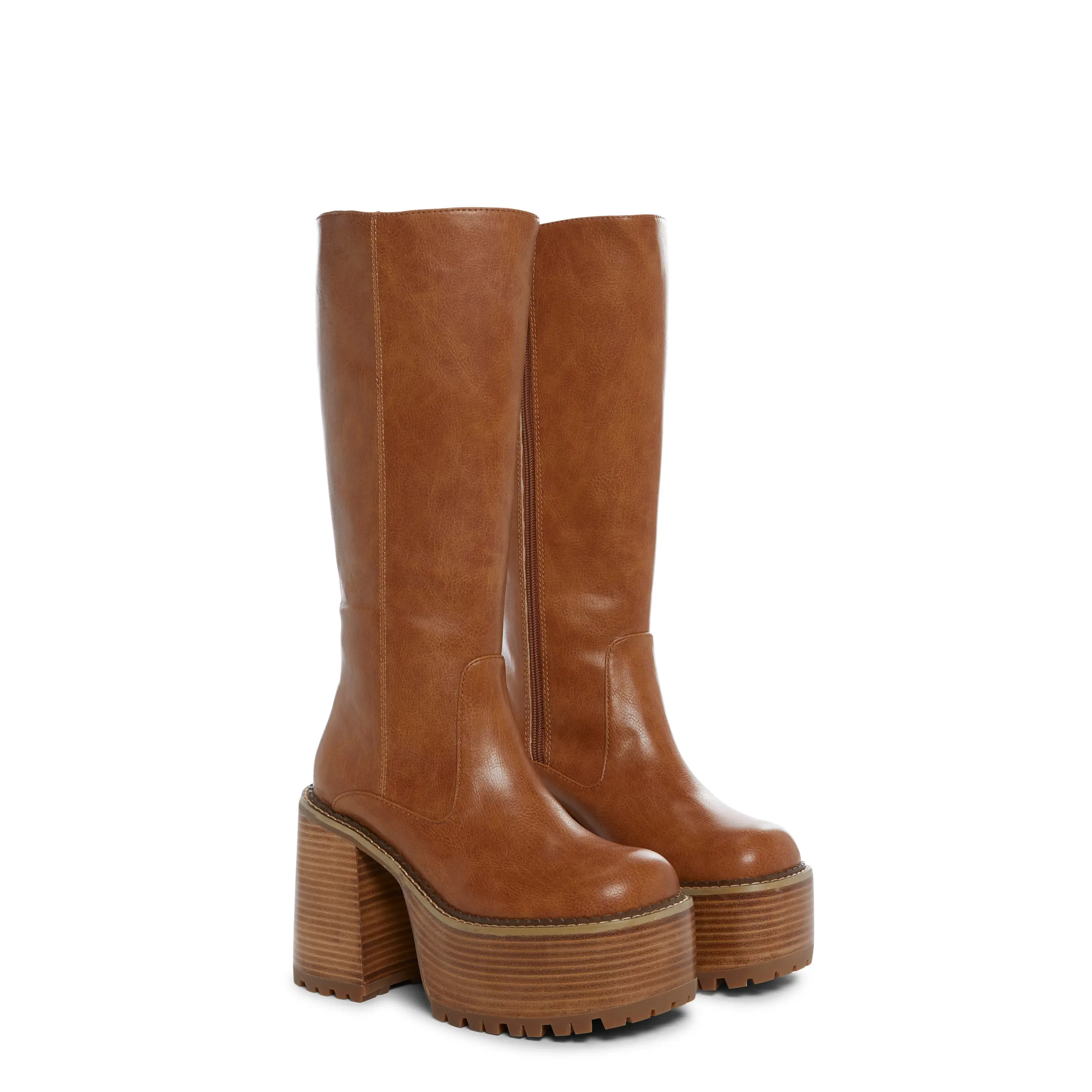 cuz you always go for the classics. These retro knee high boots have a vegan leather construction, chunky platform soles with block heels, and side zip closures.