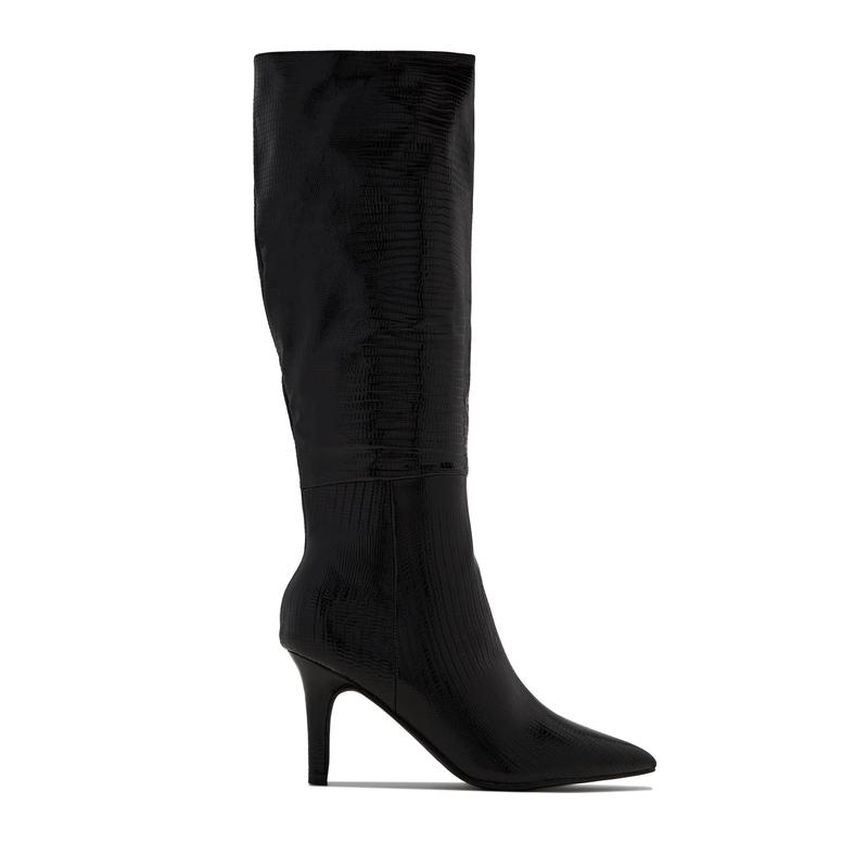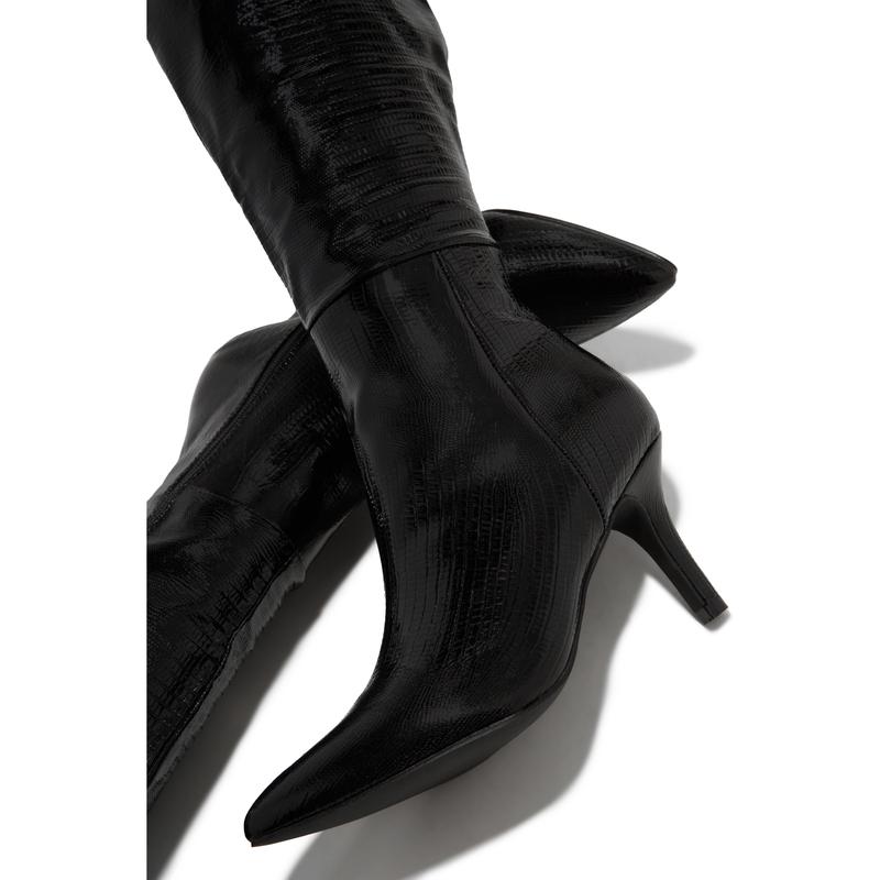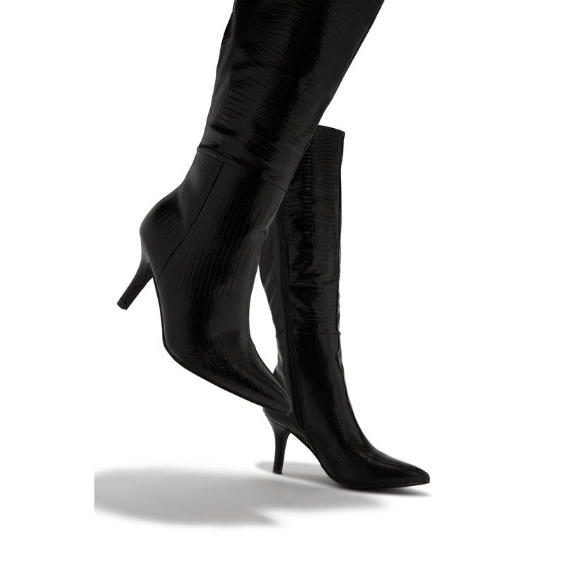 Black Embossed Croc Knee High Heel Boots
