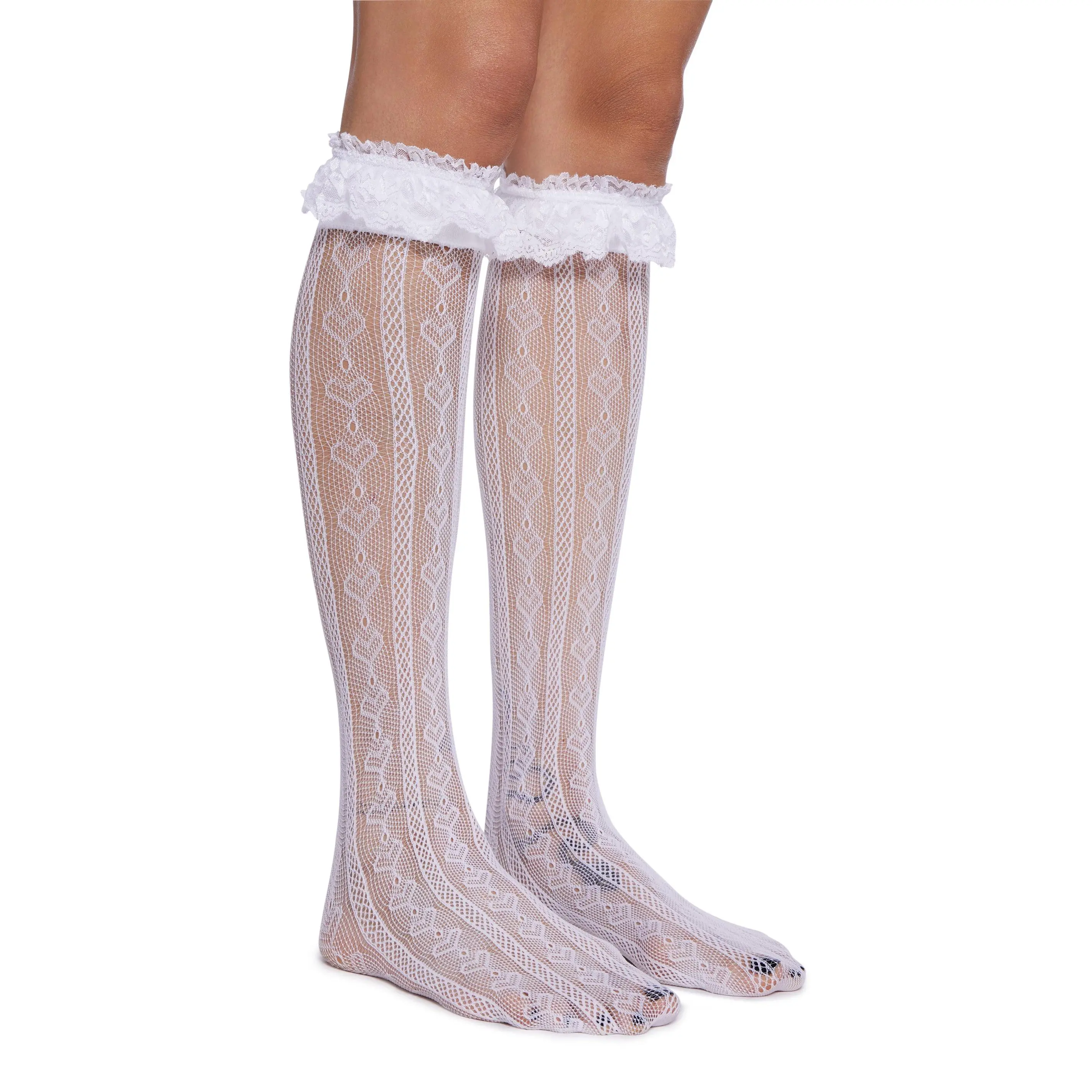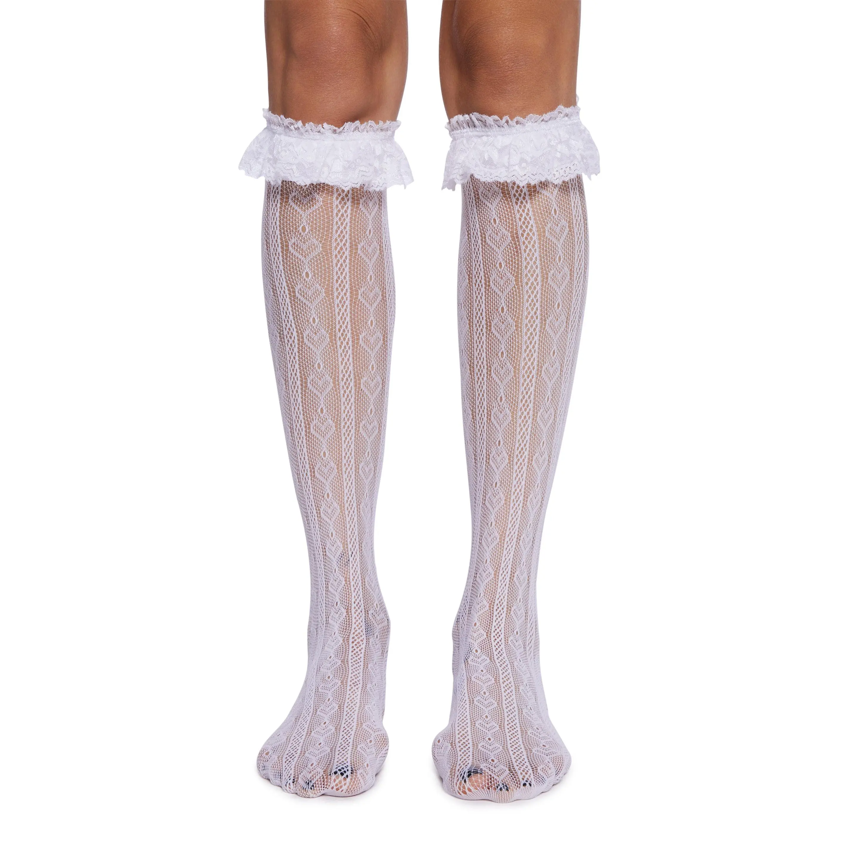 cuz it was meant to be. These knee high socks have a sheer fishnet construction, heart detailing, and a ruffled lace trim.