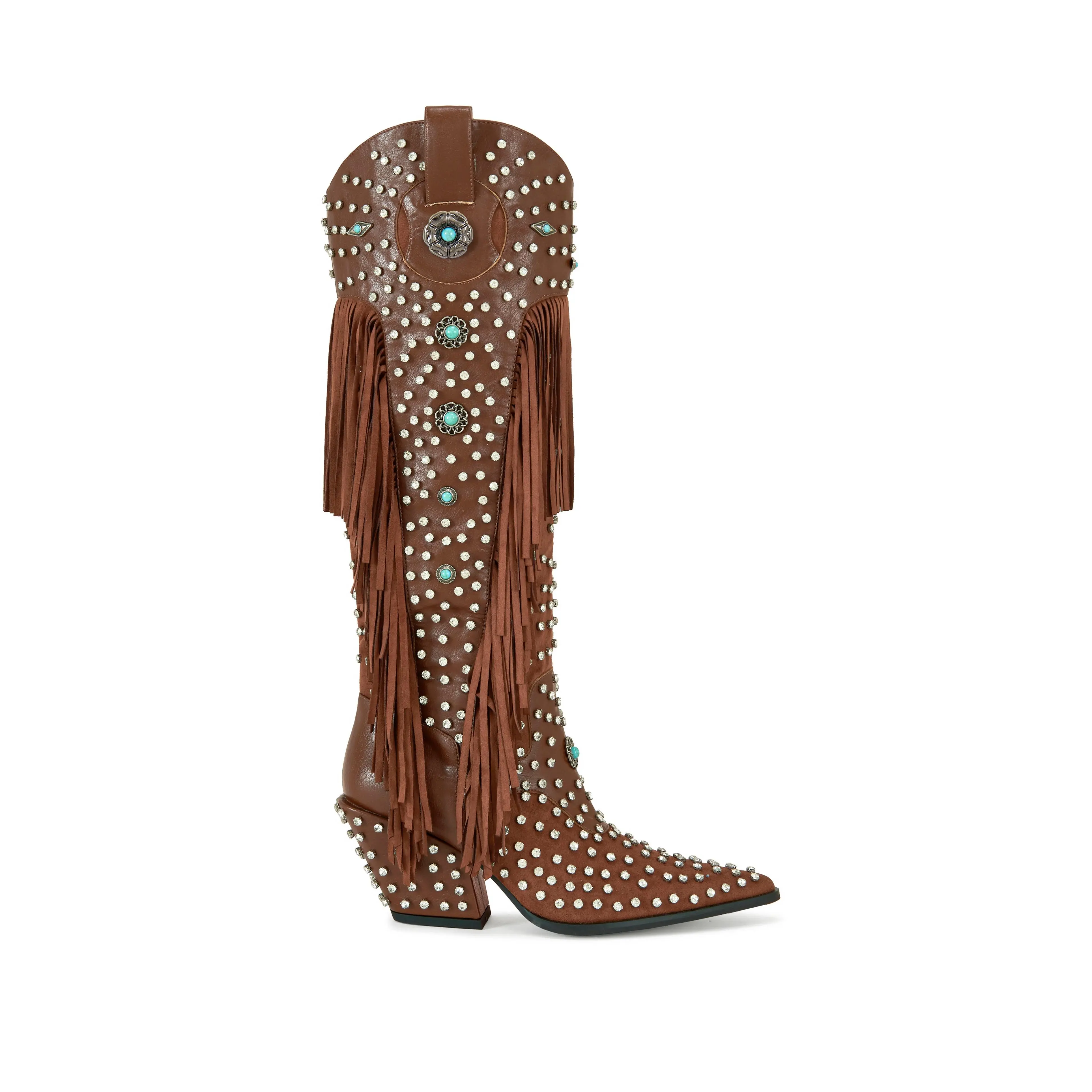 *THIS ITEM IS ON FINAL SALE, NO RETURNS OR EXCHANGES*These chic knee high Western boots are made with brown faux leather and adorned with faux suede fringe, rhinestone embellishments, and turquoise flower stud accents. Perfect for making a statement, these boots add a touch of flair to any look. These are great for a festival outfit or a fashion forward Spring outfit.