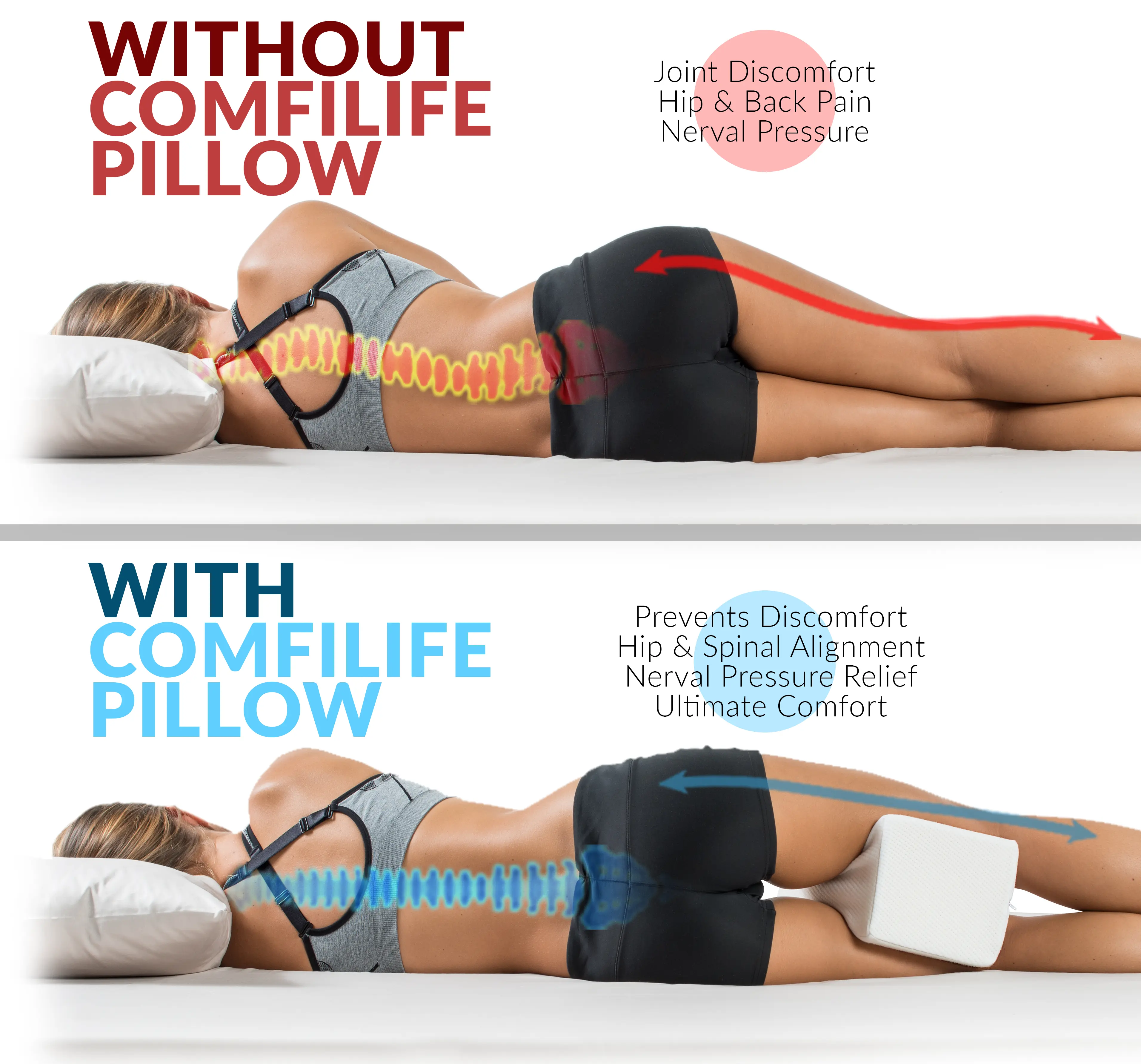 Sleep better and wake up without back or hip pain. The ComfiLife Orthopedic Knee & Leg Pillow is made with 100% high-density memory foam to support proper spinal alignment and help relieve sciatica, lower back, and hip discomfort—perfect for side sleepers.