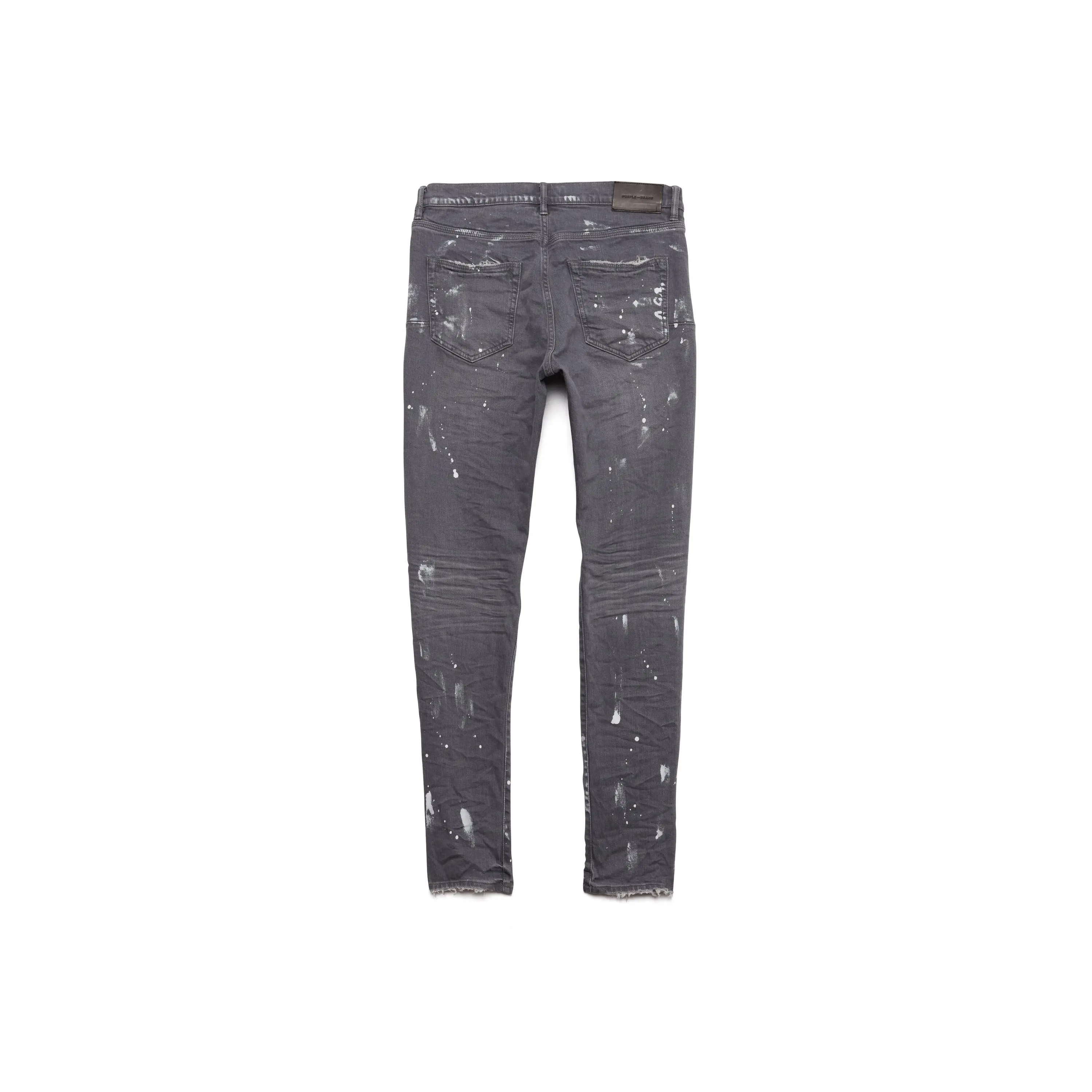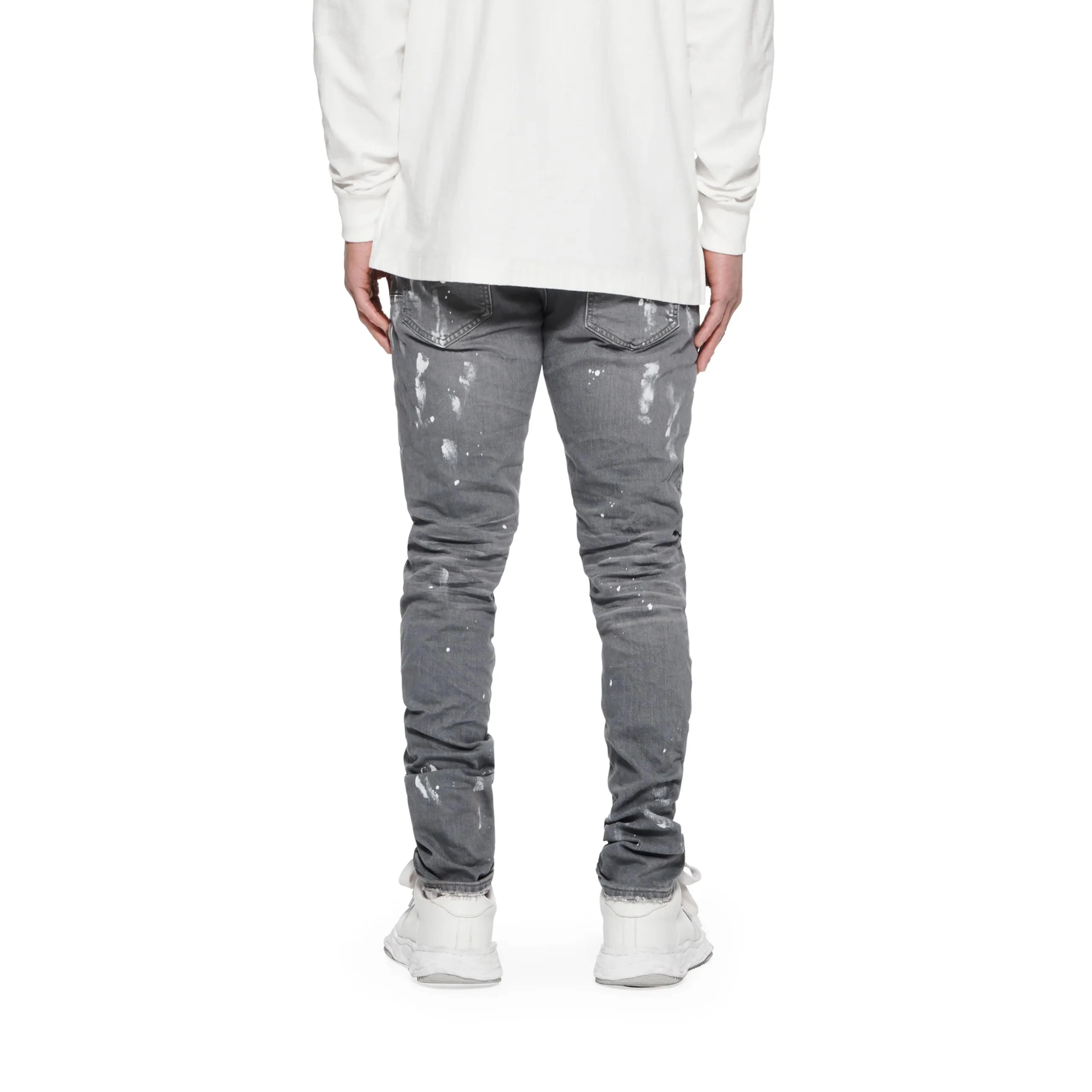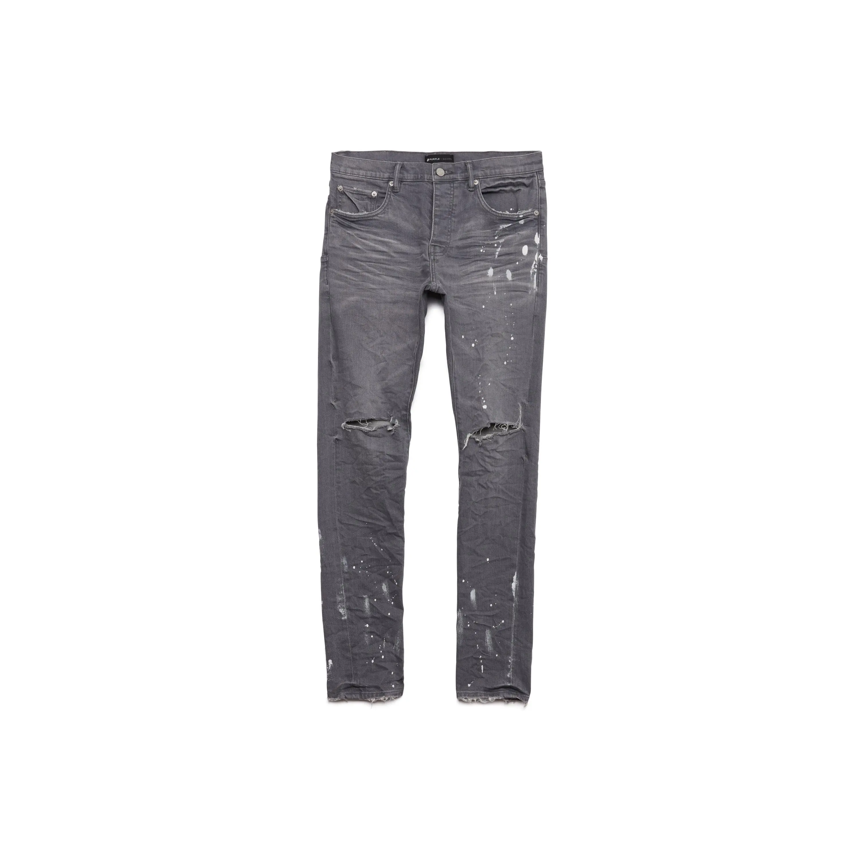Constructed in a vintage grey wash, this elevated denim is designed with blowout detailing at the knee, hand-applied paint splatter, and a 3D wrinkle treatment for a distressed and vintage feel.