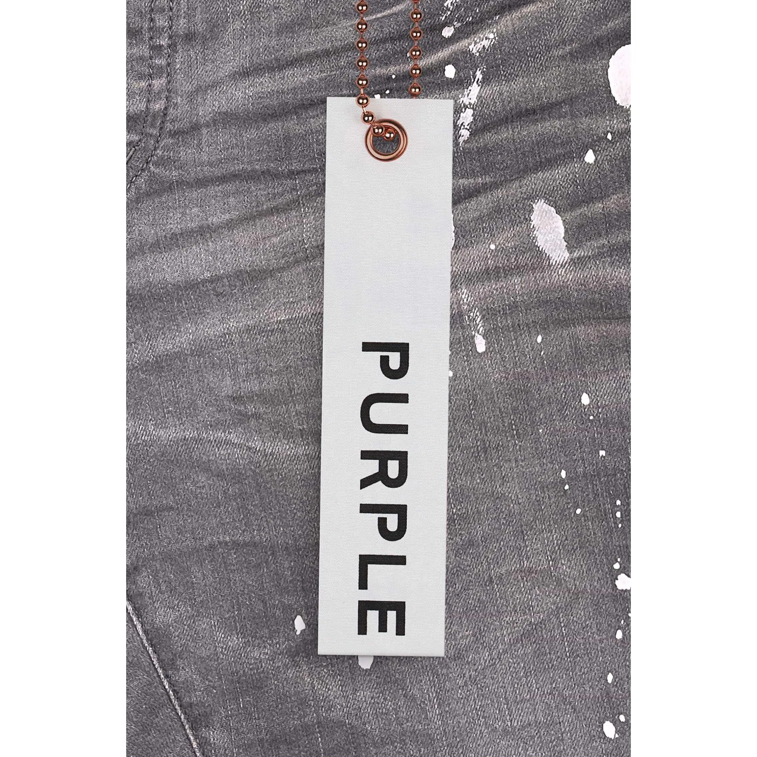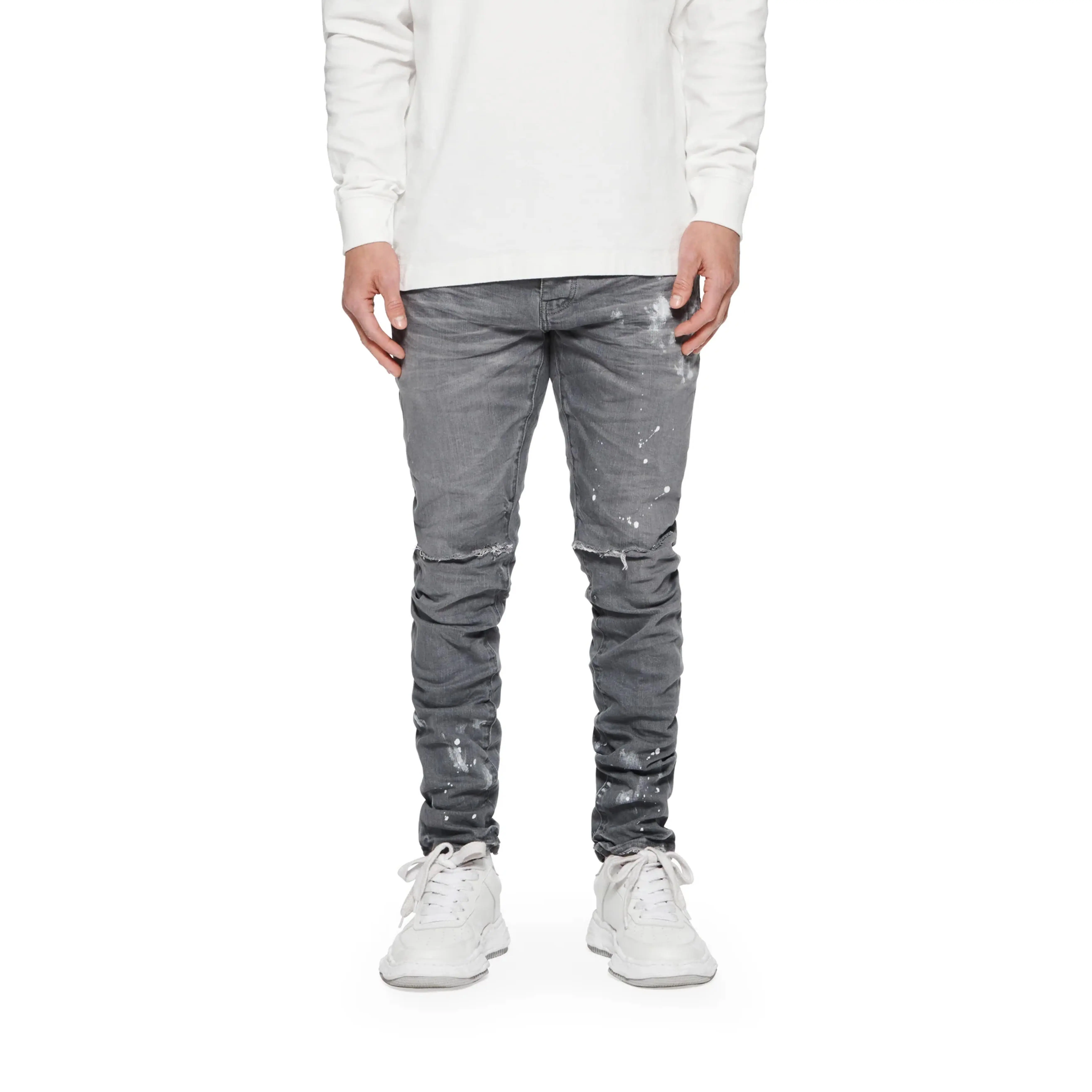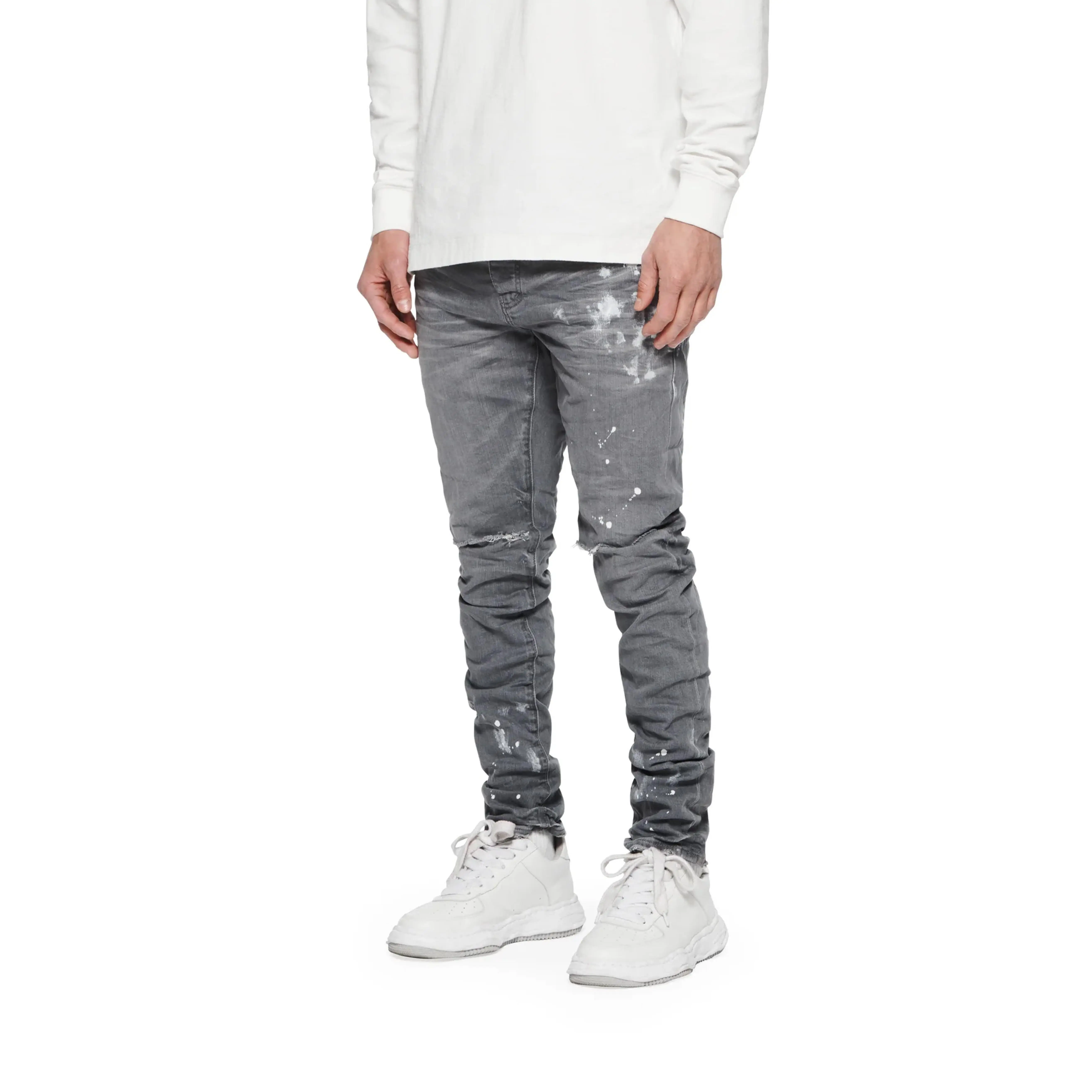 Constructed in a vintage grey wash, this elevated denim is designed with blowout detailing at the knee, hand-applied paint splatter, and a 3D wrinkle treatment for a distressed and vintage feel.