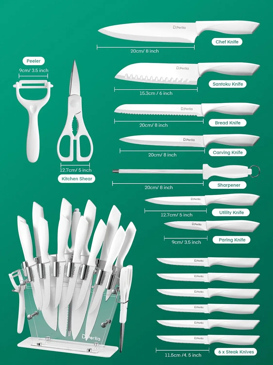 This set includes essential knives: 8" chef, carving, bread, santoku, utility, paring, steak, peeler, and scissors. It also features 8" sharpening steel and an acrylic stand. Cover all your cutting needs—from vegetables to meats. A perfect blend of functionality and convenience.