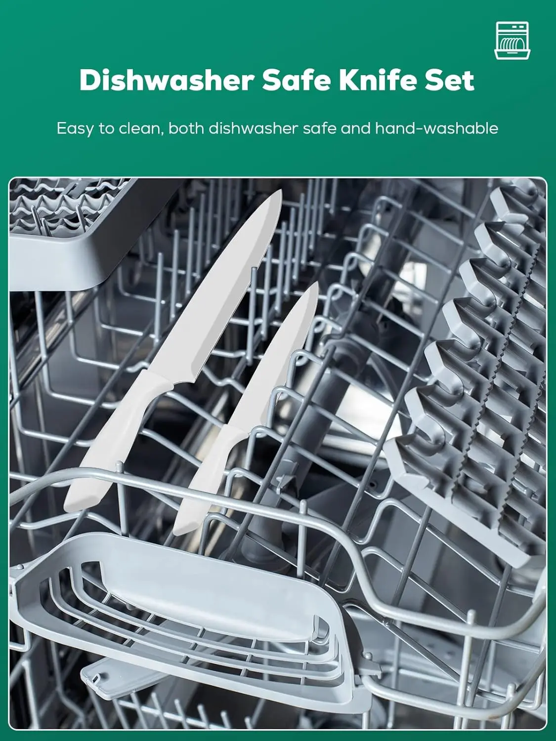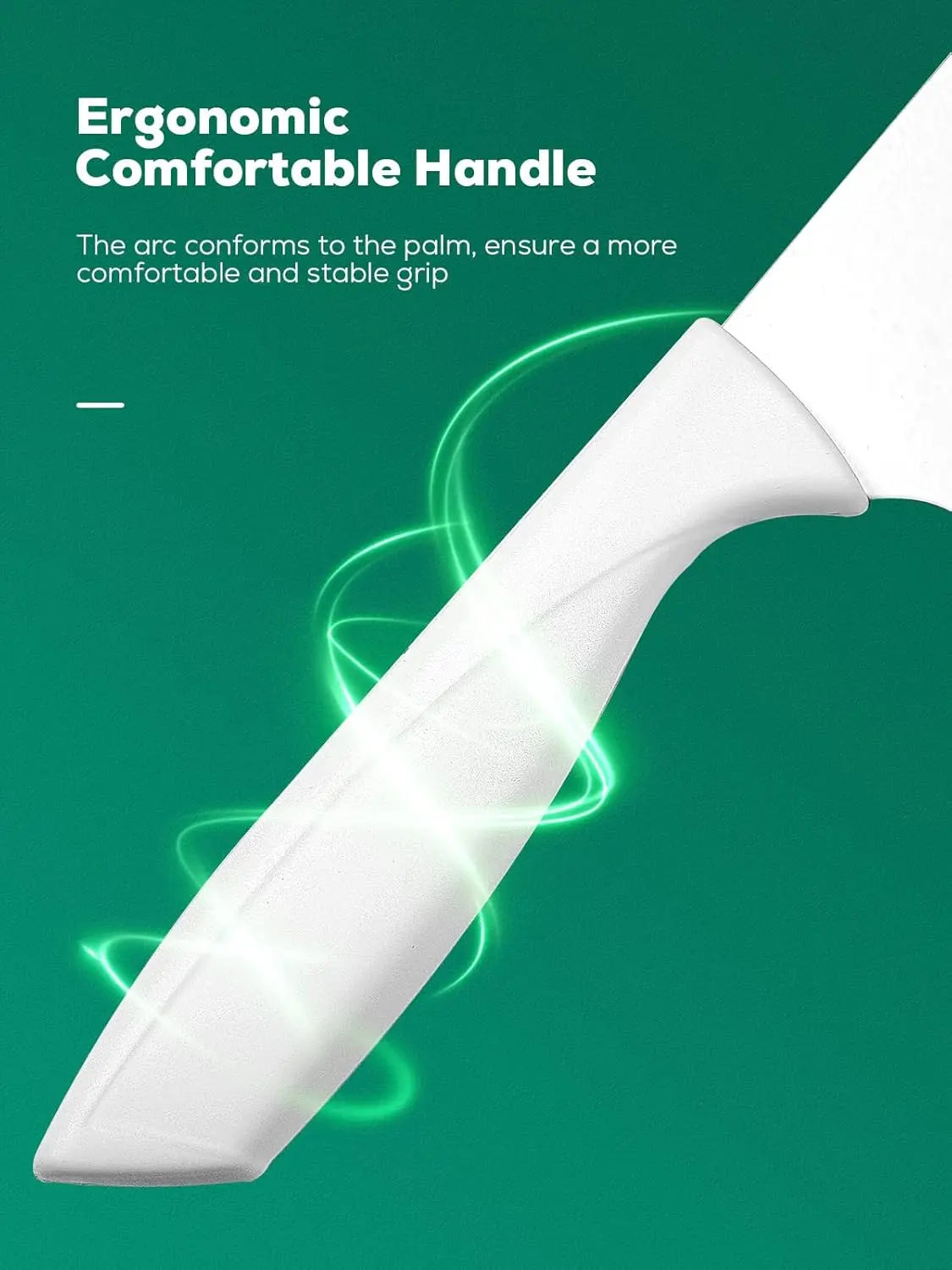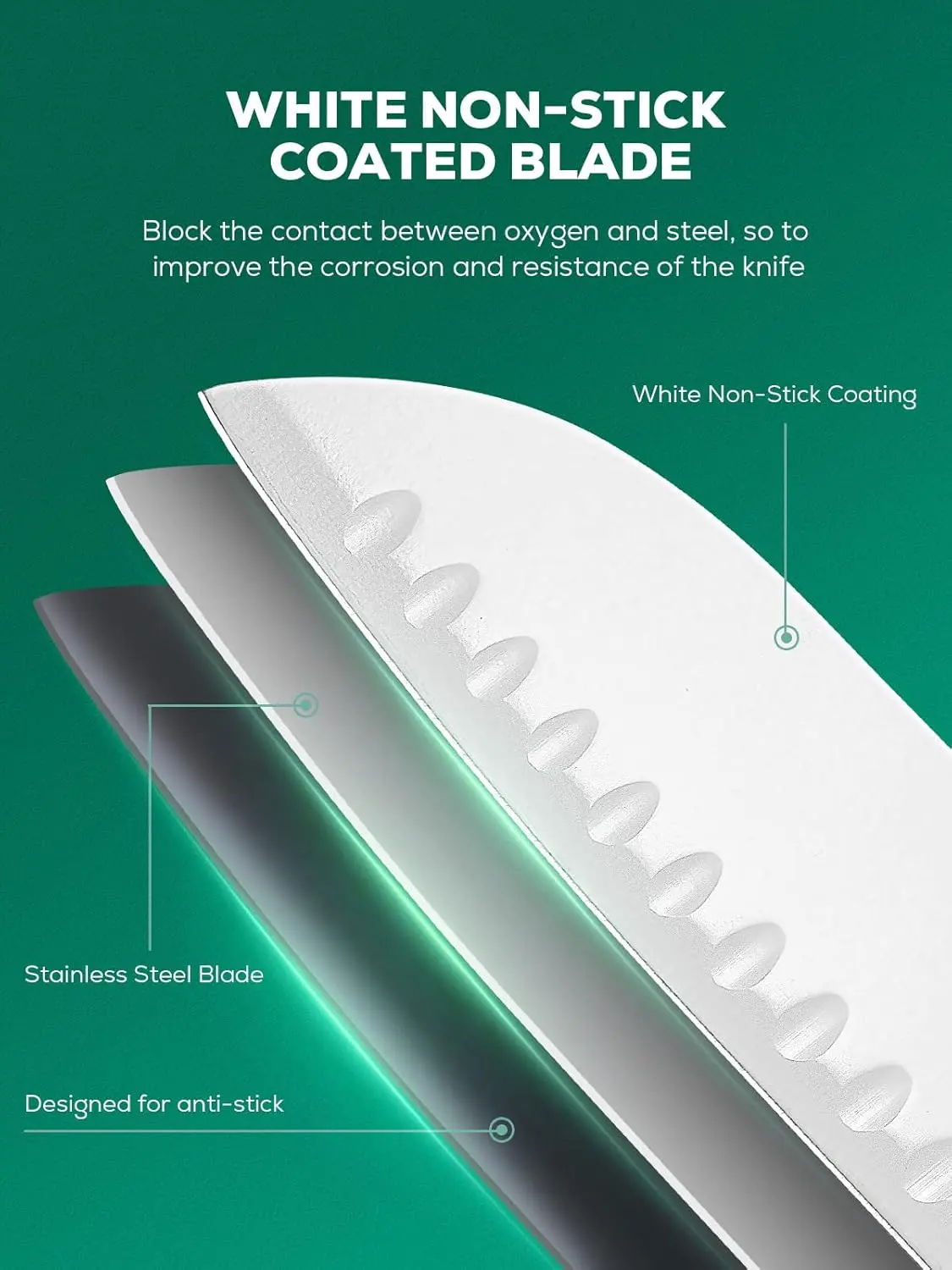 The white non-stick coated stainless steel blades are food-grade and rust-resistant. Made from superior high carbon steel, they are sharp and durable. Achieve precise cutting results every time. The set is designed for longevity and reliability in your kitchen.