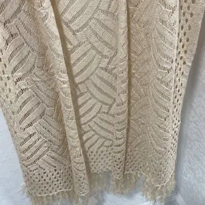 I love this and ordered another. The main part is a beautiful, silky-ish, stretchy fabric. I did have to IMMEDIATELY remove the fringe, as it was low quality and just not good at all. Tangled and thin. If you have the patience, it’s worth finding a better type of string and would be easy to add the fringe back on. It’s still beautiful without it.