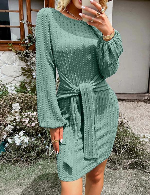 ·ăUnique designă:long lantern sleeve dress/bodycon sweater dress/women round neck dress/long sleeve Knit dress/womens pencil dress/tie waist dress/women casual belted dresses.