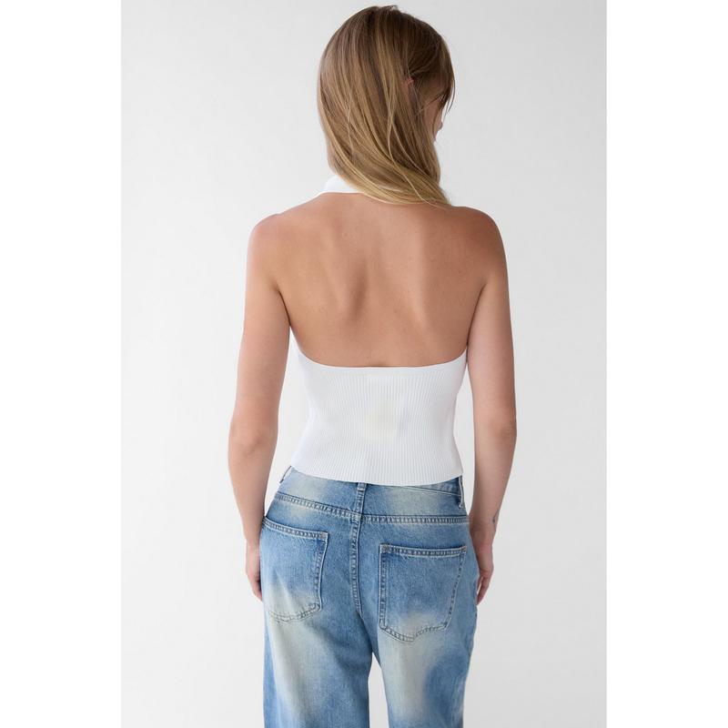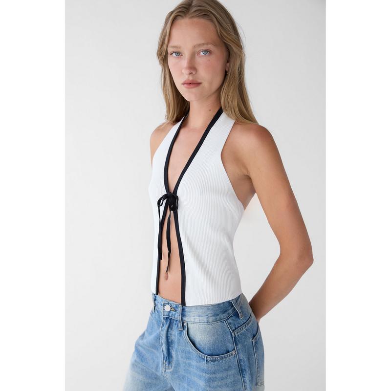 This knit halter neckline top is made in a slim fit from a ribbed knit. It has an open back and a contrast trim front with ties. A flirty summer top you can wear with midi satin skirts to jeans. DETAILS Drapey ribbed knit. Halter neck design. Contrast front with bow ties. FIT & SIZING