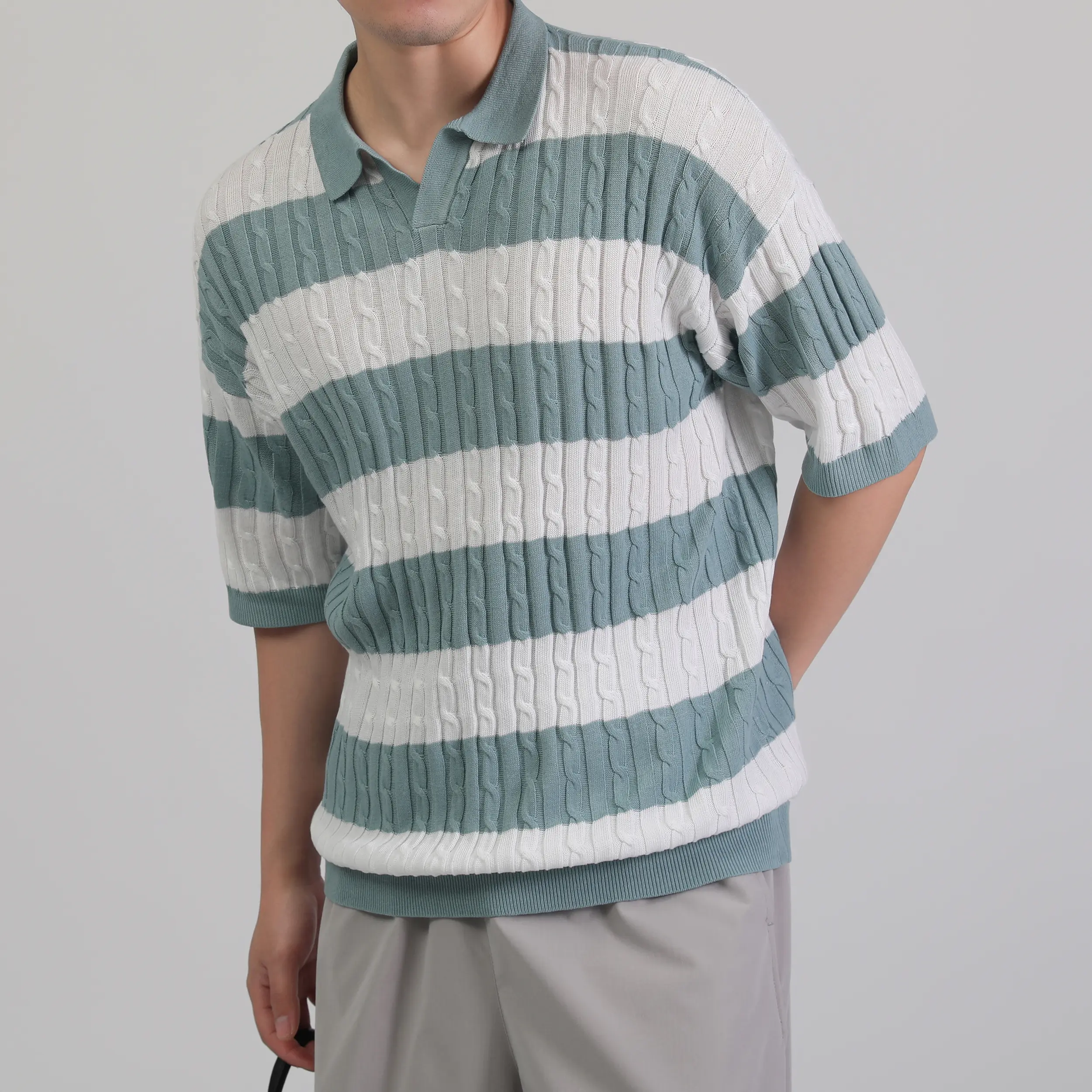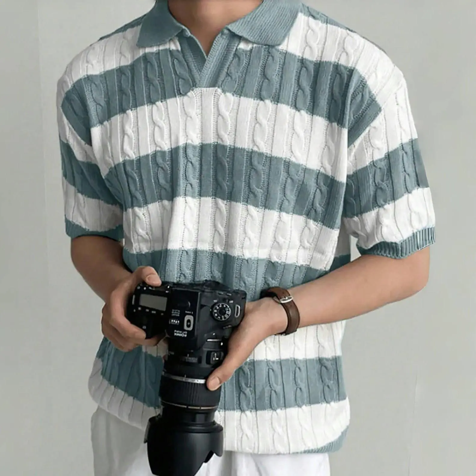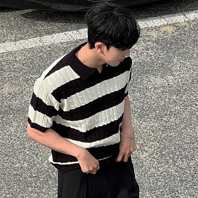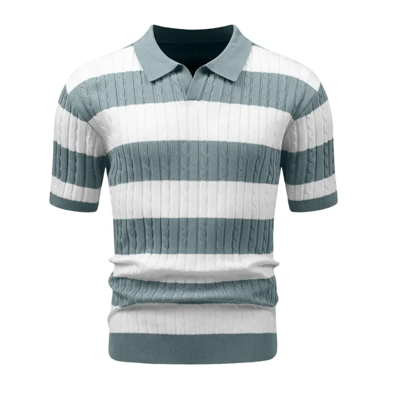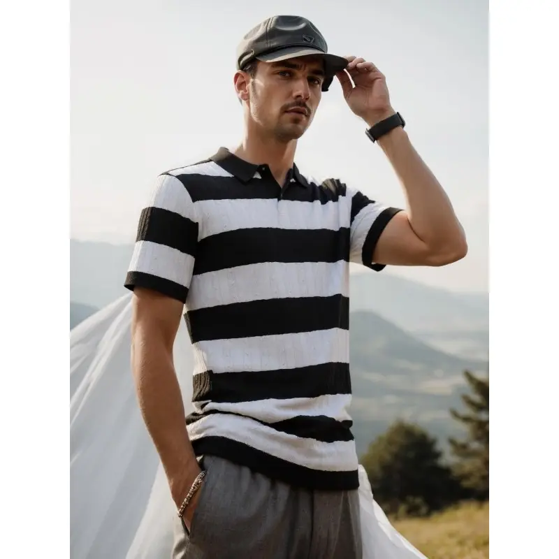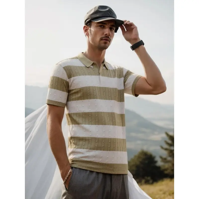 ·FEATURES: short sleeves and a folded-down polo collar. It features a hollow-knit fabric texture with a vintage contrast design. The combination of a solid color base and horizontal stripe pattern makes it a timeless and stylish choice.