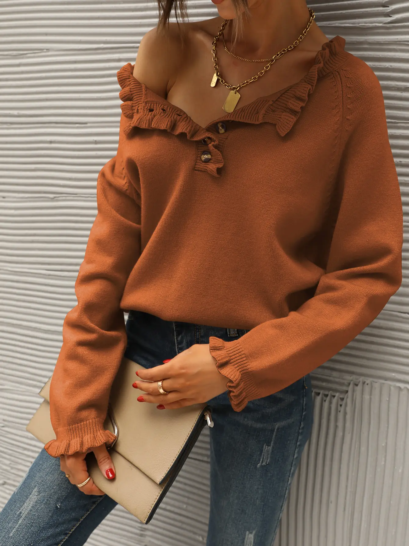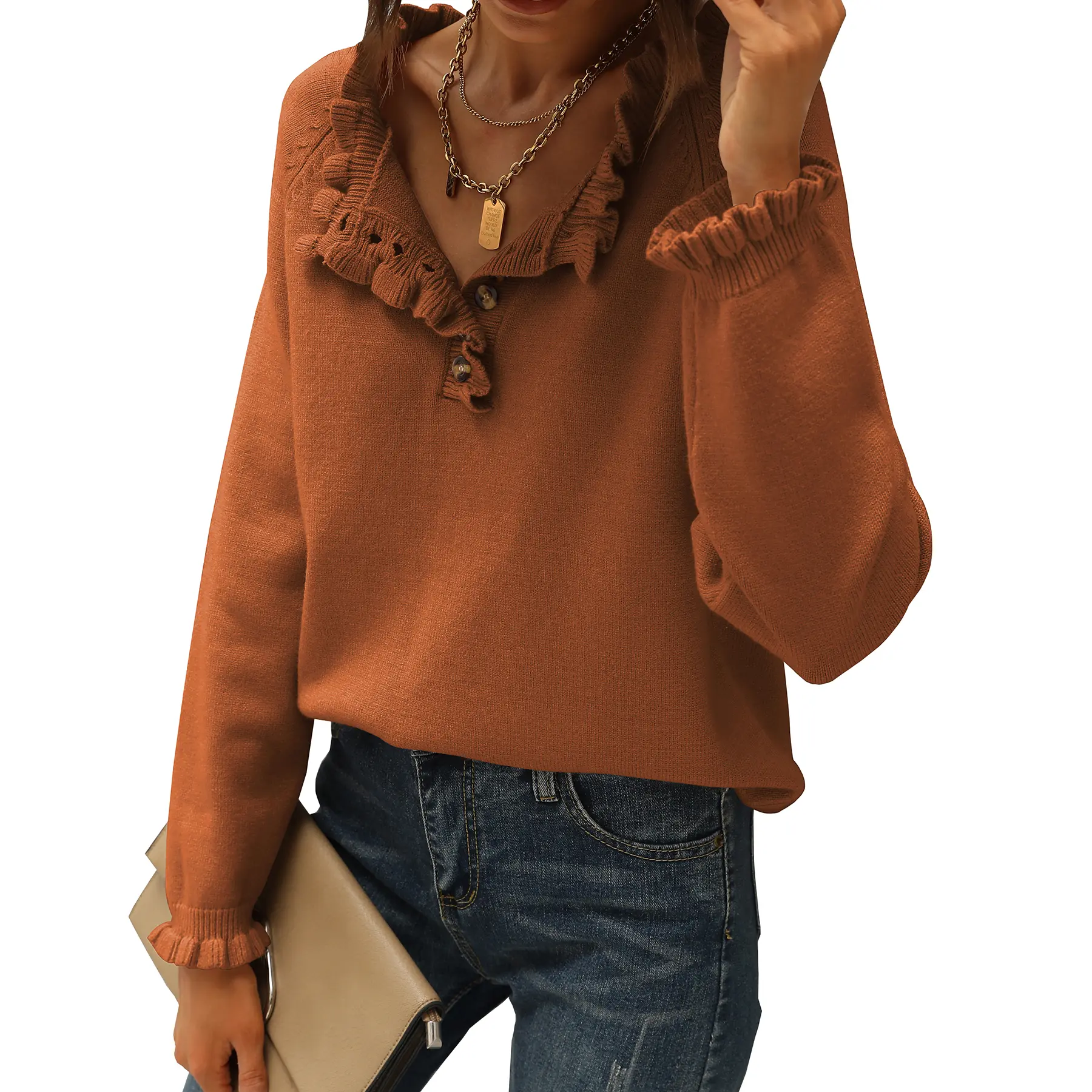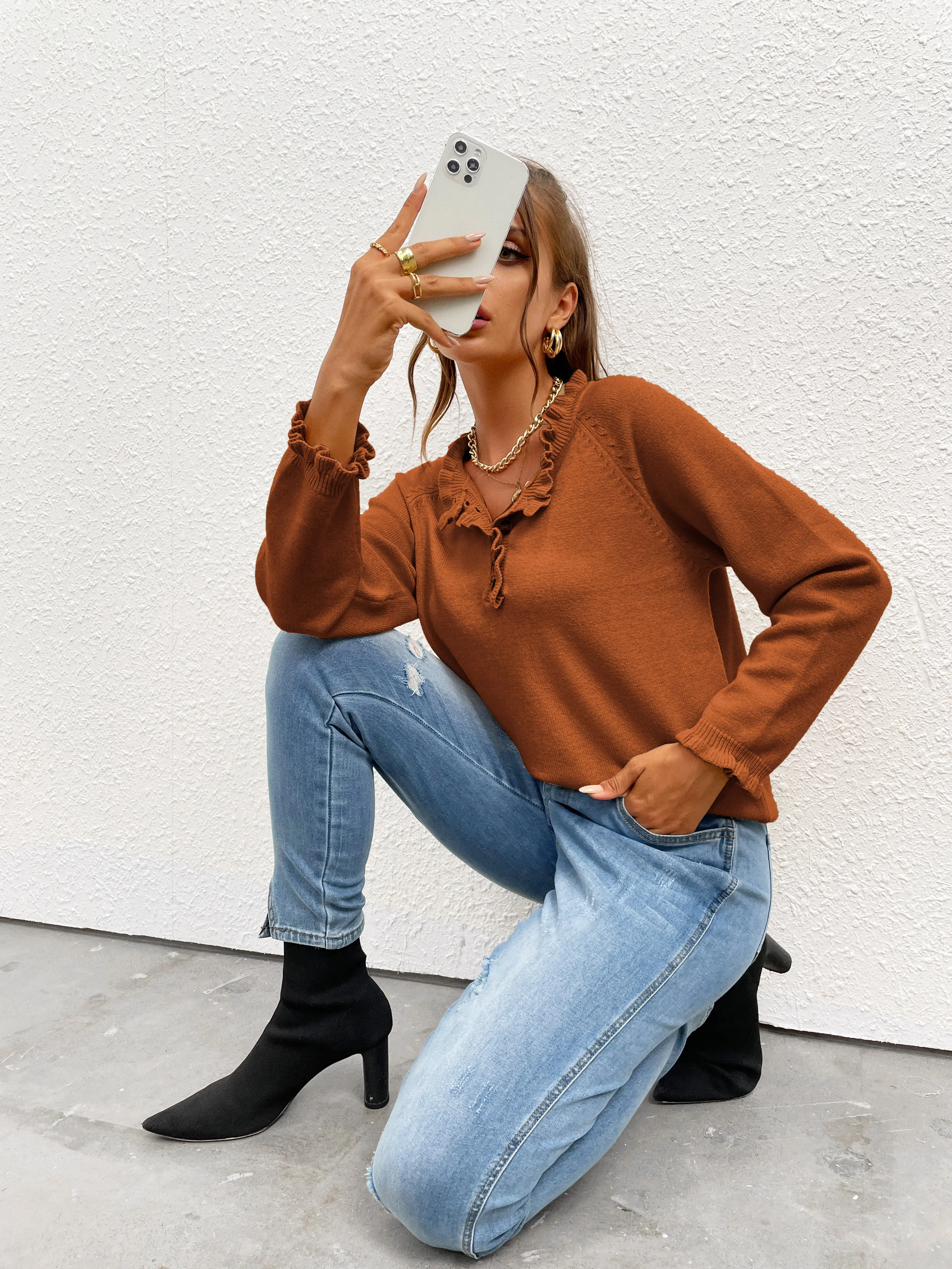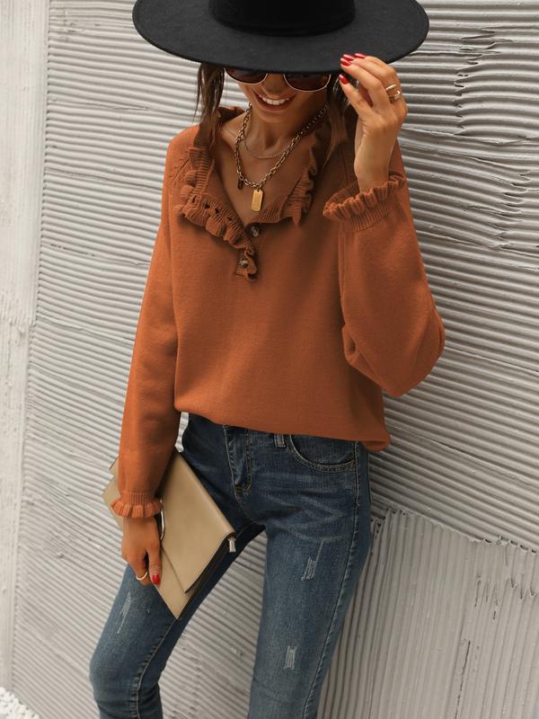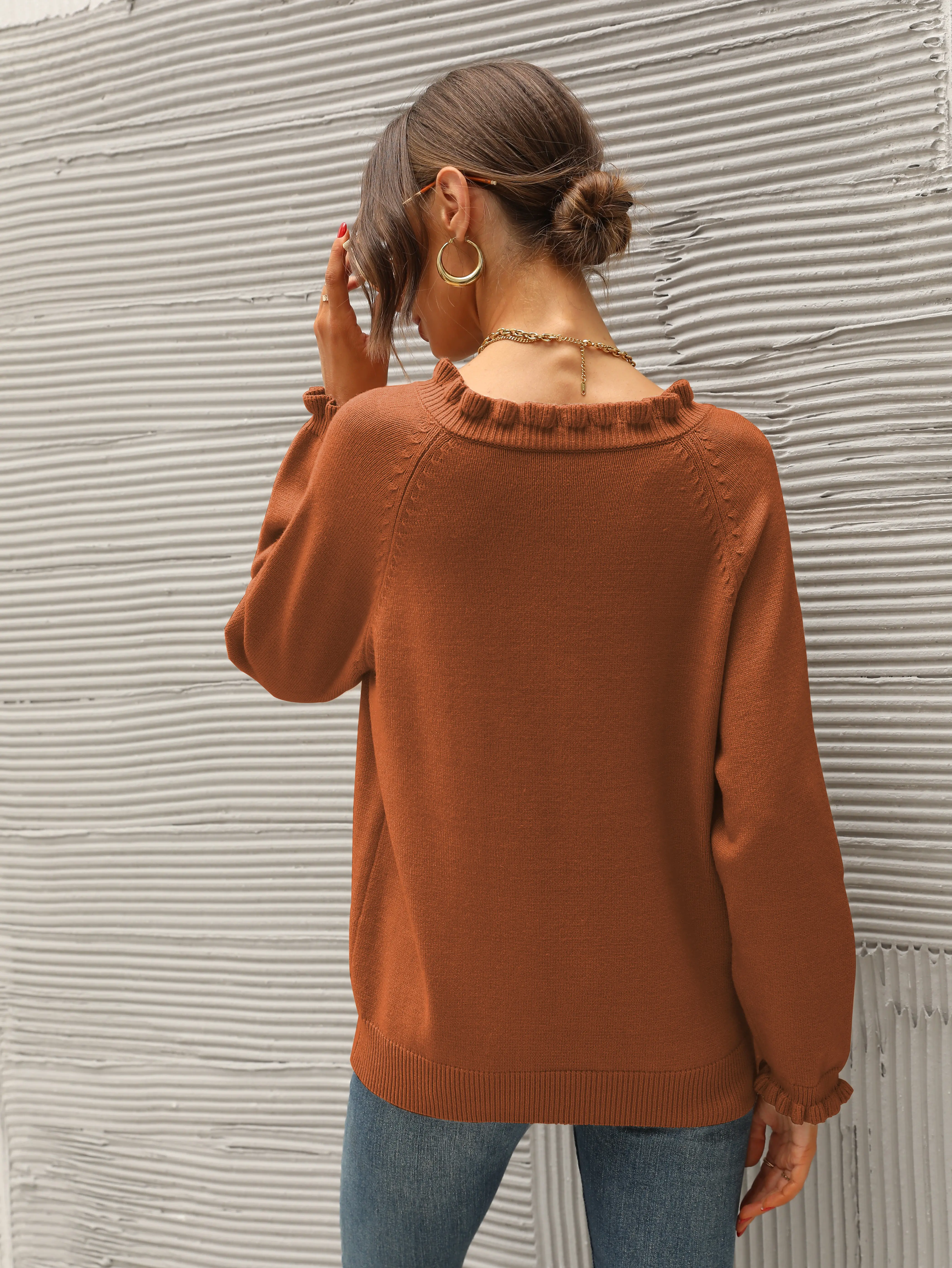 This sweater is perfect for fall! The ruffle collar and sleeve make it special. So soft.