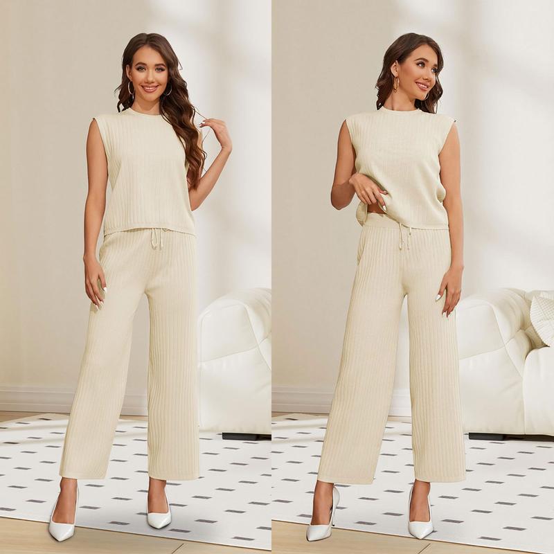 ·Sleeveless knit lounge sets for women feature solid color and crew neck tops pullover, wide leg pants with drawstring design