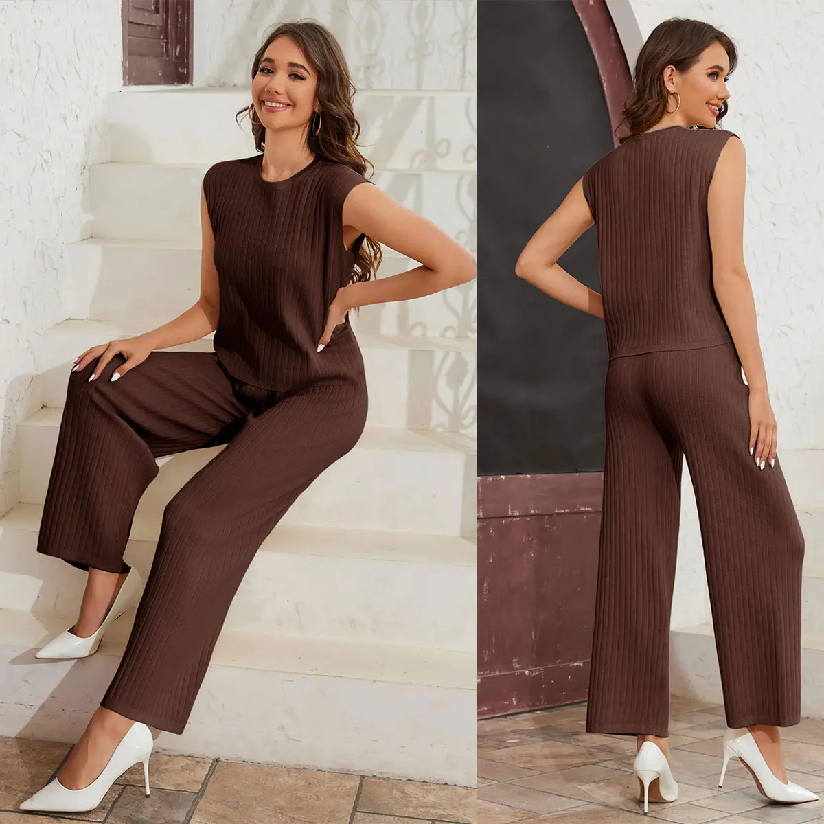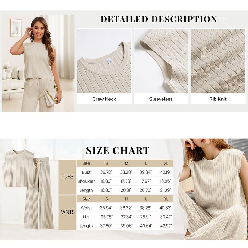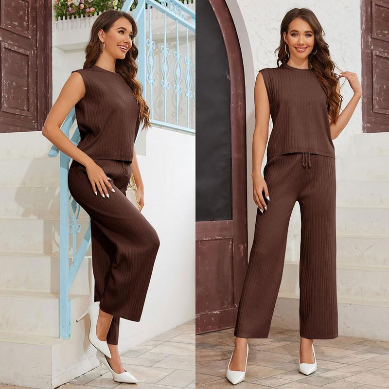 Sleeveless knit lounge sets for women feature solid color and crew neck tops pullover, wide leg pants with drawstring design
