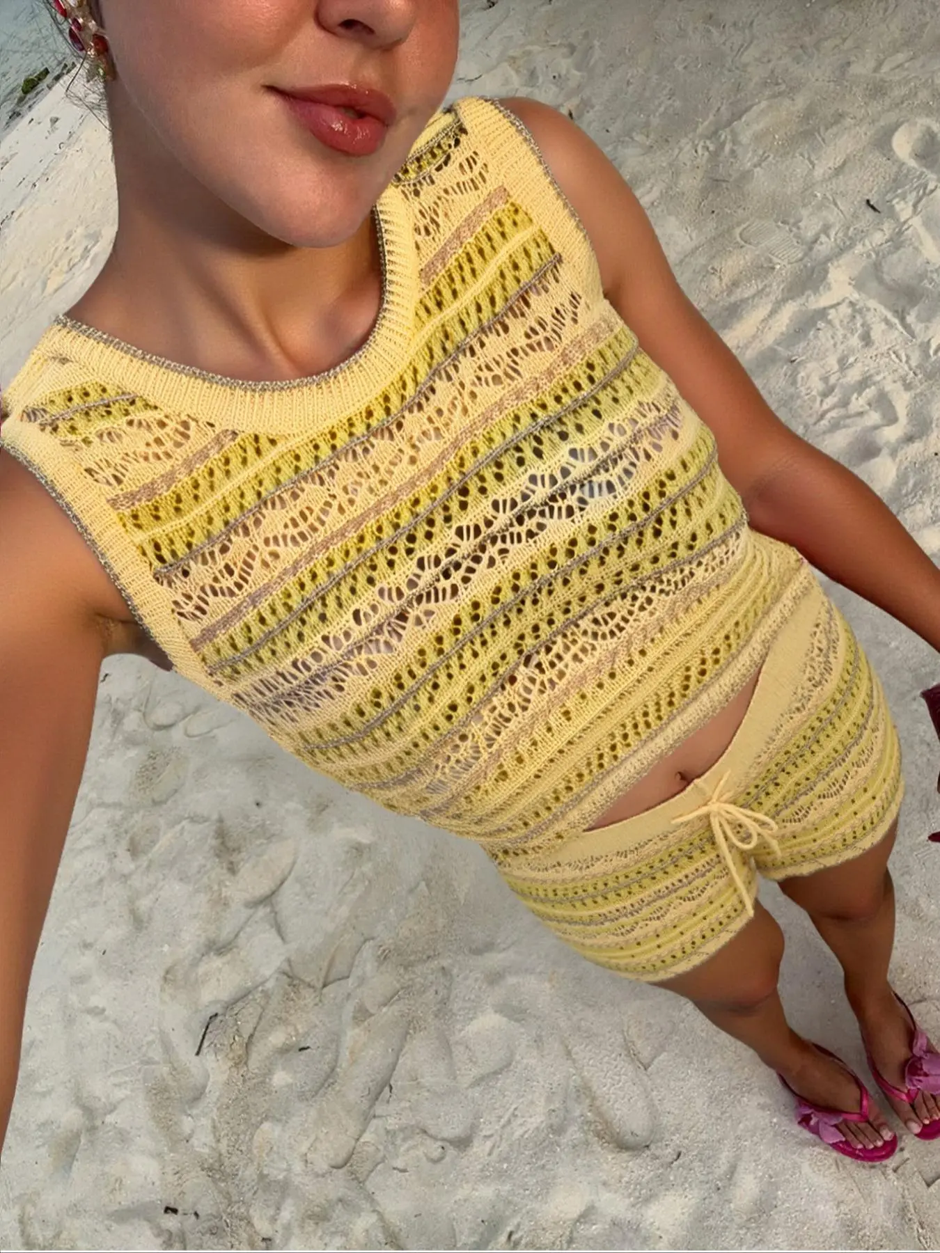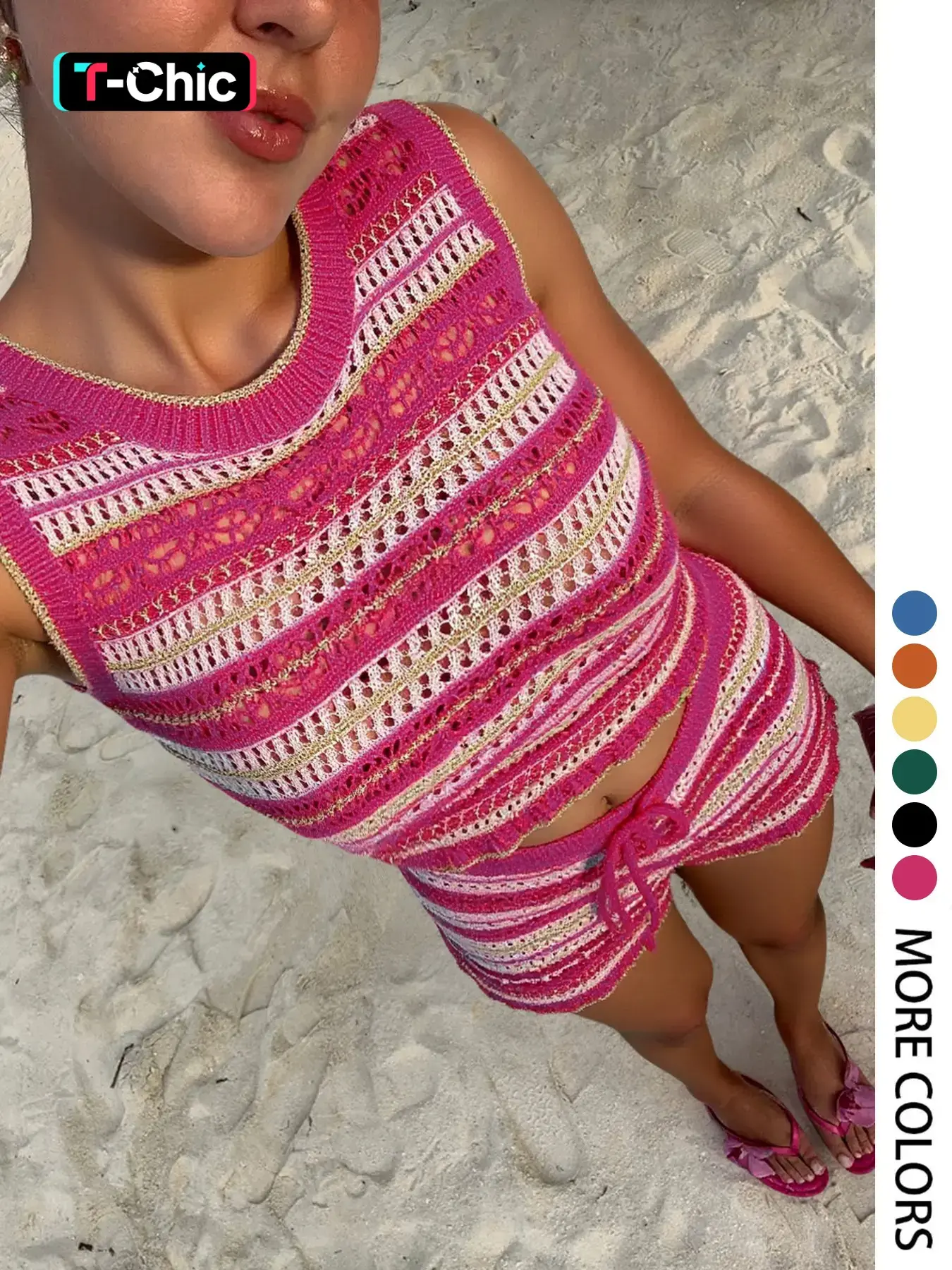 Women's Knit Set Casual Chic Hollow Out Sexy Slim Fitted Elastic Shorts Tank Top Spring Summer Sleeveless Two Piece Knitted Set (random Pattern)