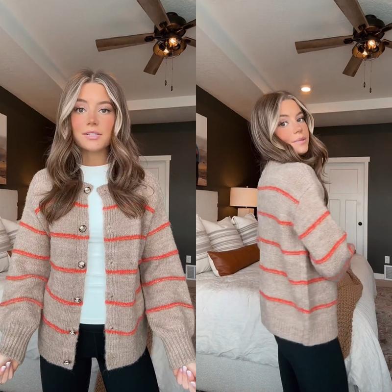 ·Features: loose fit contrasting colors striped cardigan,long lantern sleeve cardigans,drop shoulder knitted tops,chic golden button down sweater coat,crewneck fall knit cardigan for women.