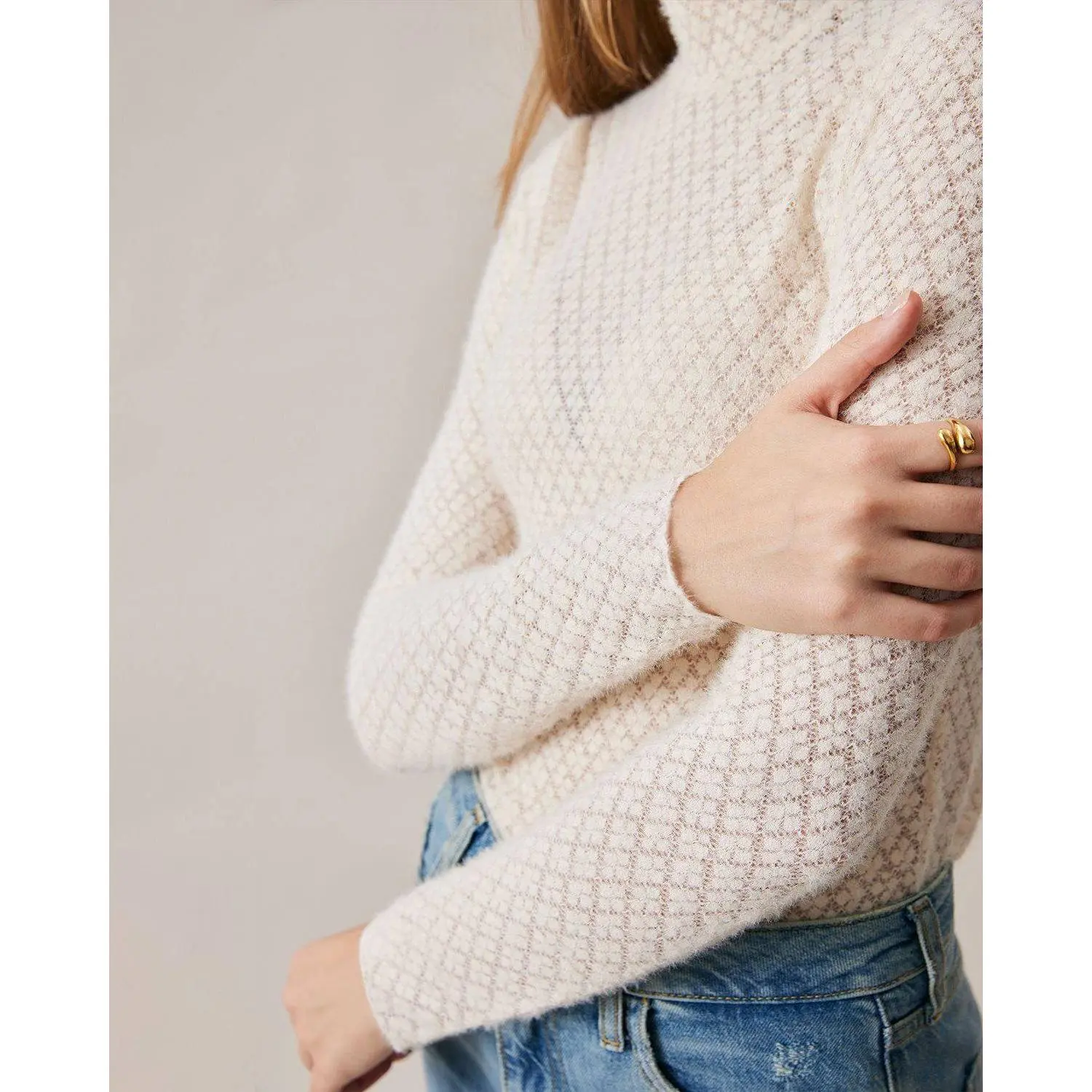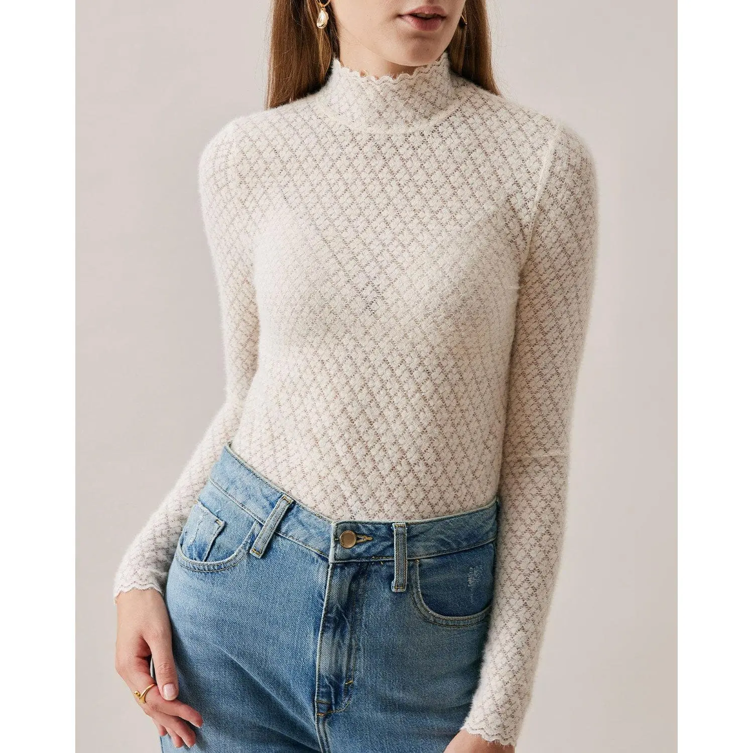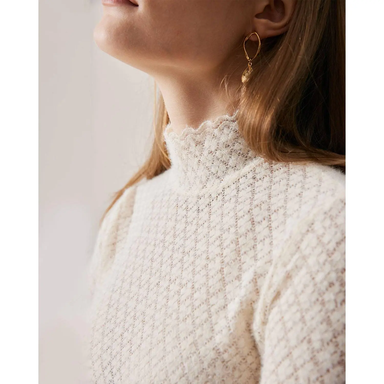 Details: - Stand collar - See-through design - Lace details - Regular fitting - Ribbed - Knitted