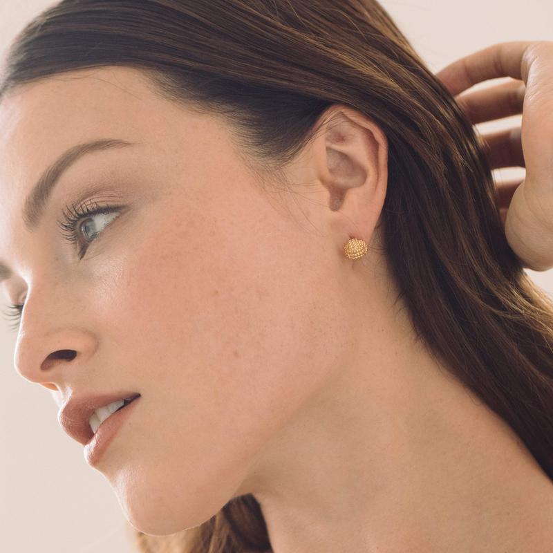 The detailed design of our Parker Knot Earrings comes from the coastal inspiration traditional monkey fist knots, which are commonly used for both boating and decor. Finished in 14K gold, these are a fun alternative to traditional gold studs. A stainless steel post with friction back offers a comfortable and secure fit.