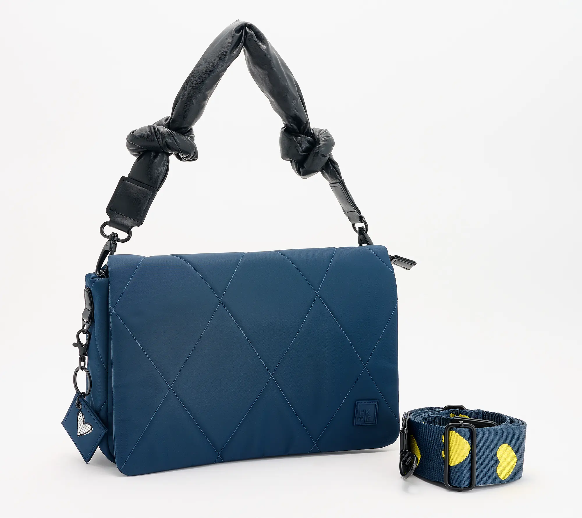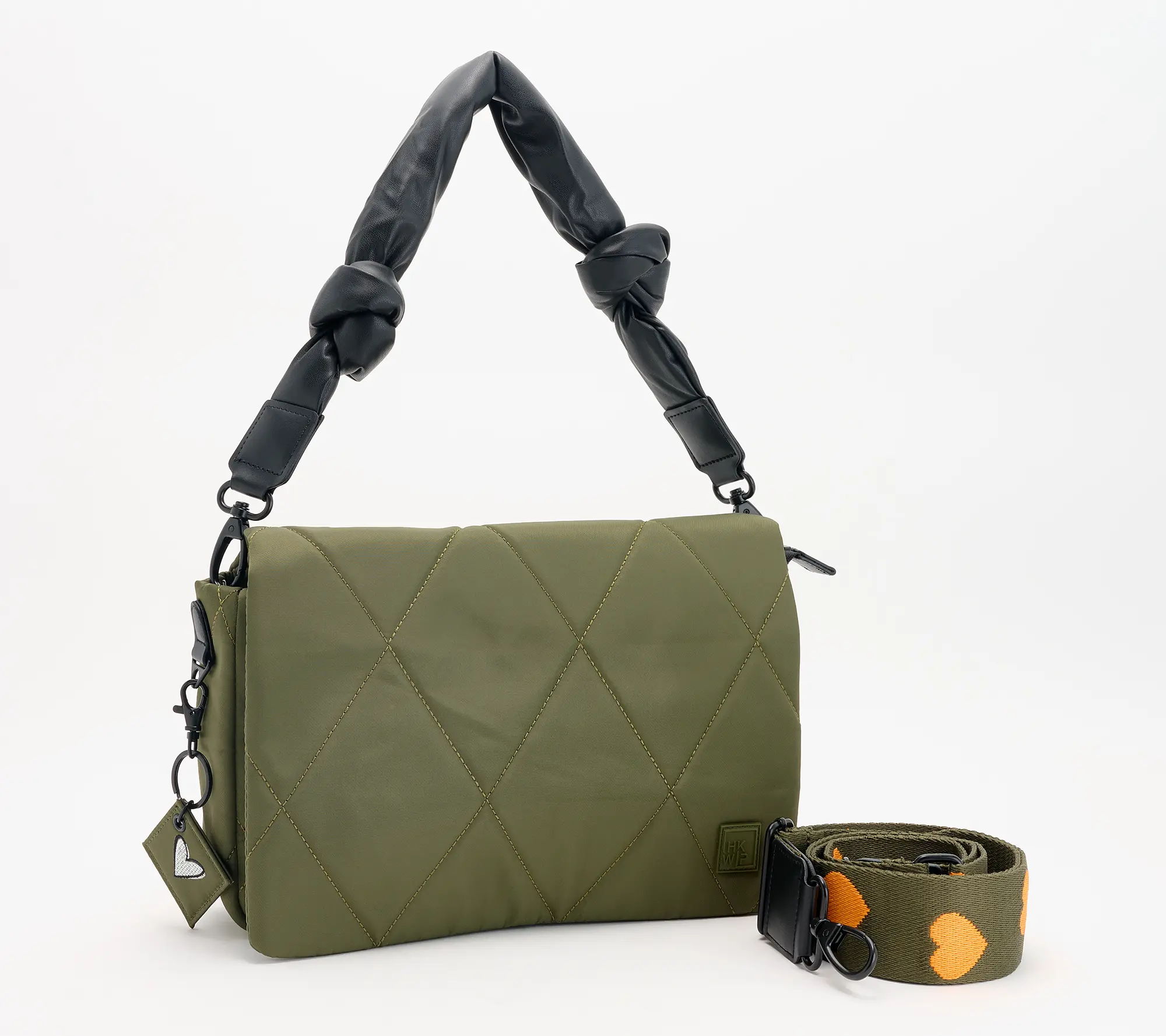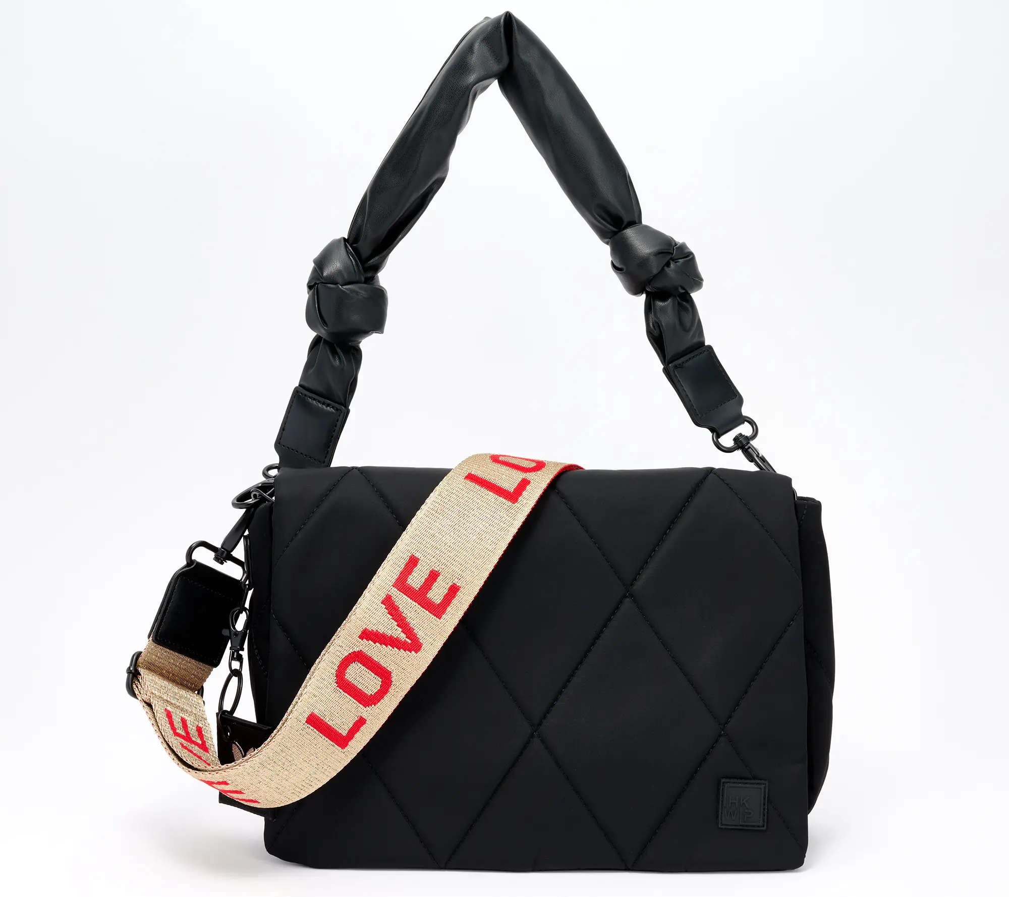 We're so smitten with this knotted shoulder bag (and we think you will be too!). The quilted carryall features a hands-free convertible silhouette, with a large exterior pocket for cell phones, readers, and sunglasses. Make a style statement with the contrasting heart guitar strap or use the black double-knot shoulder strap for added texture. From Shawn Killinger x IHKWIP.