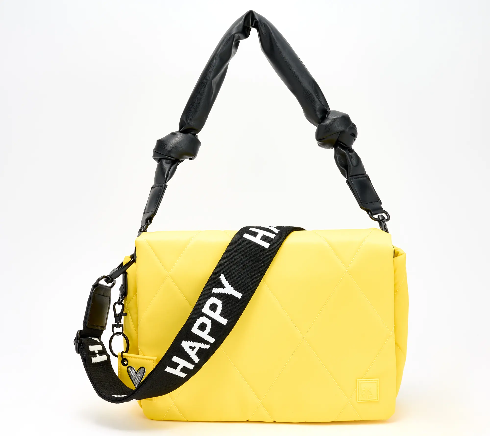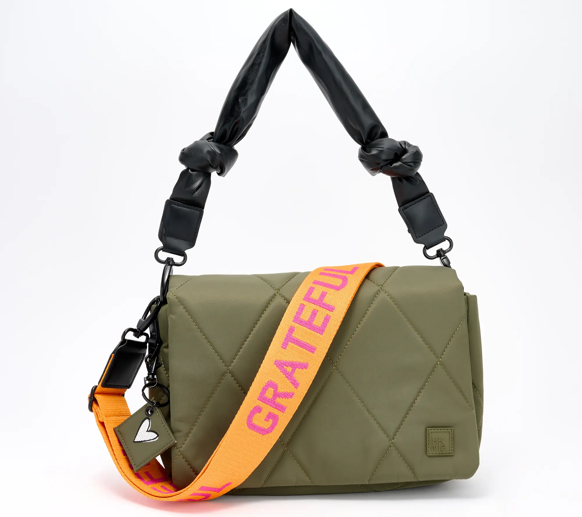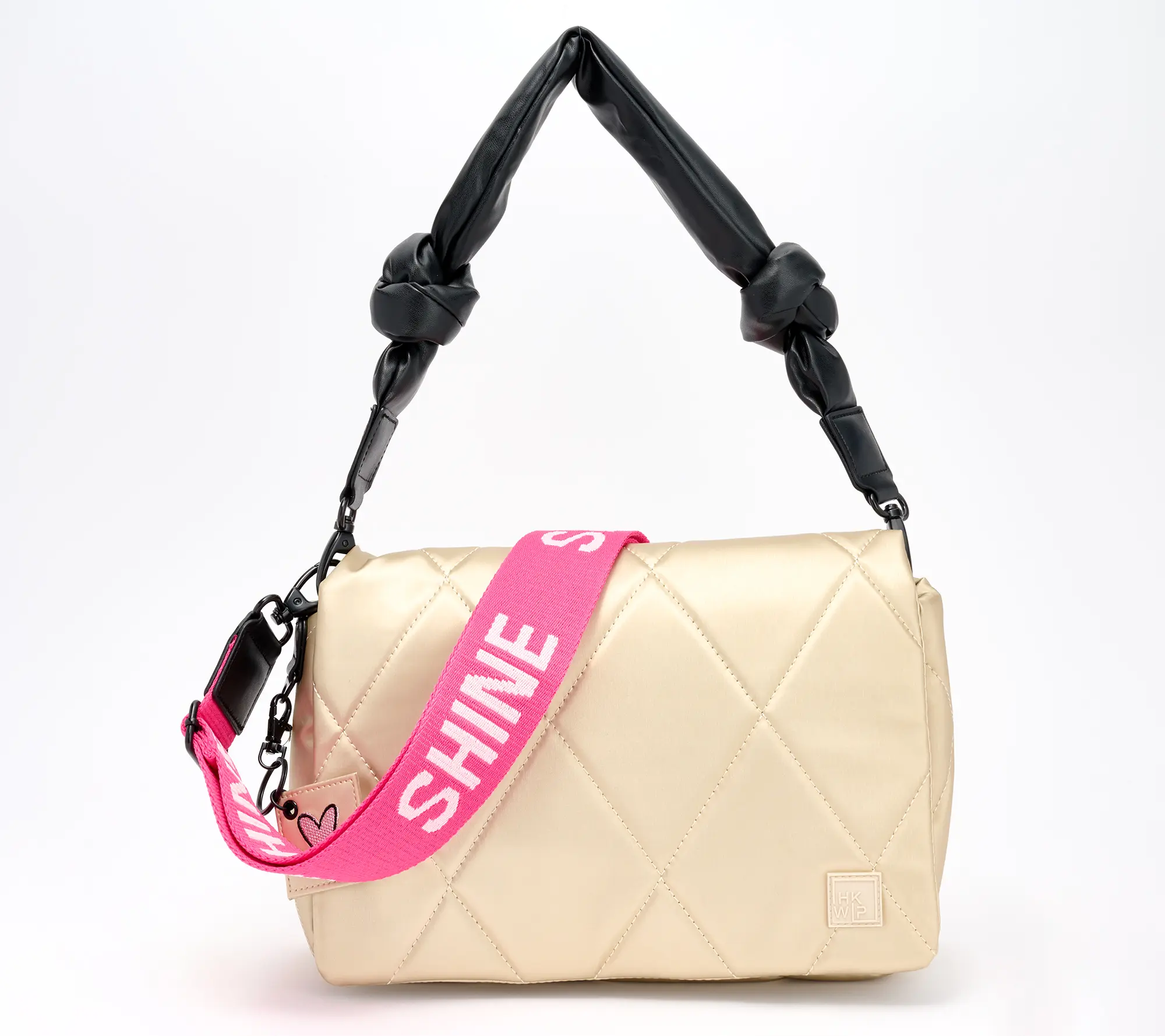 We're so smitten with this knotted shoulder bag (and we think you will be too!). The quilted carryall features a hands-free convertible silhouette, with a large exterior pocket for cell phones, readers, and sunglasses. Make a style statement with the contrasting heart guitar strap or use the black double-knot shoulder strap for added texture. From Shawn Killinger x IHKWIP.