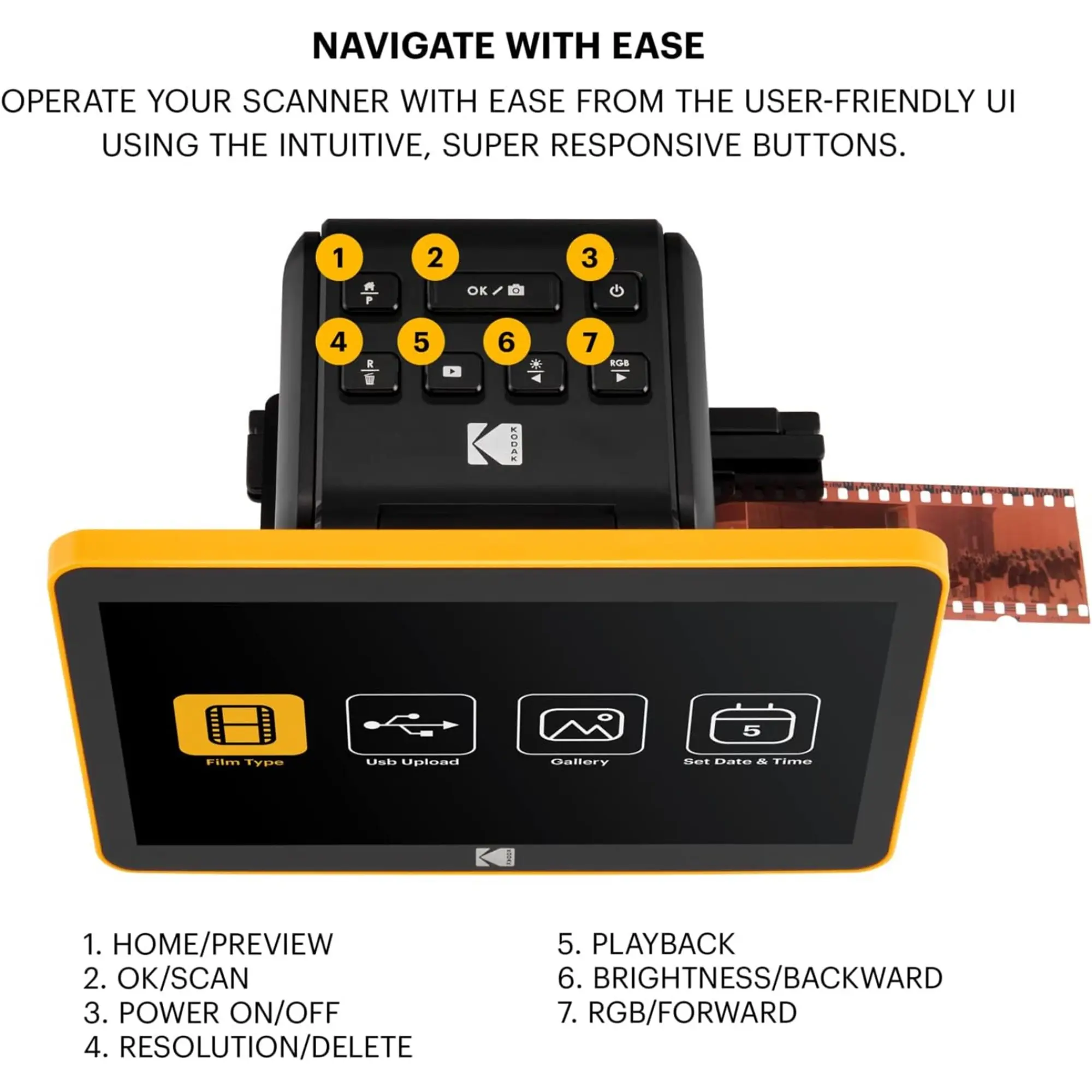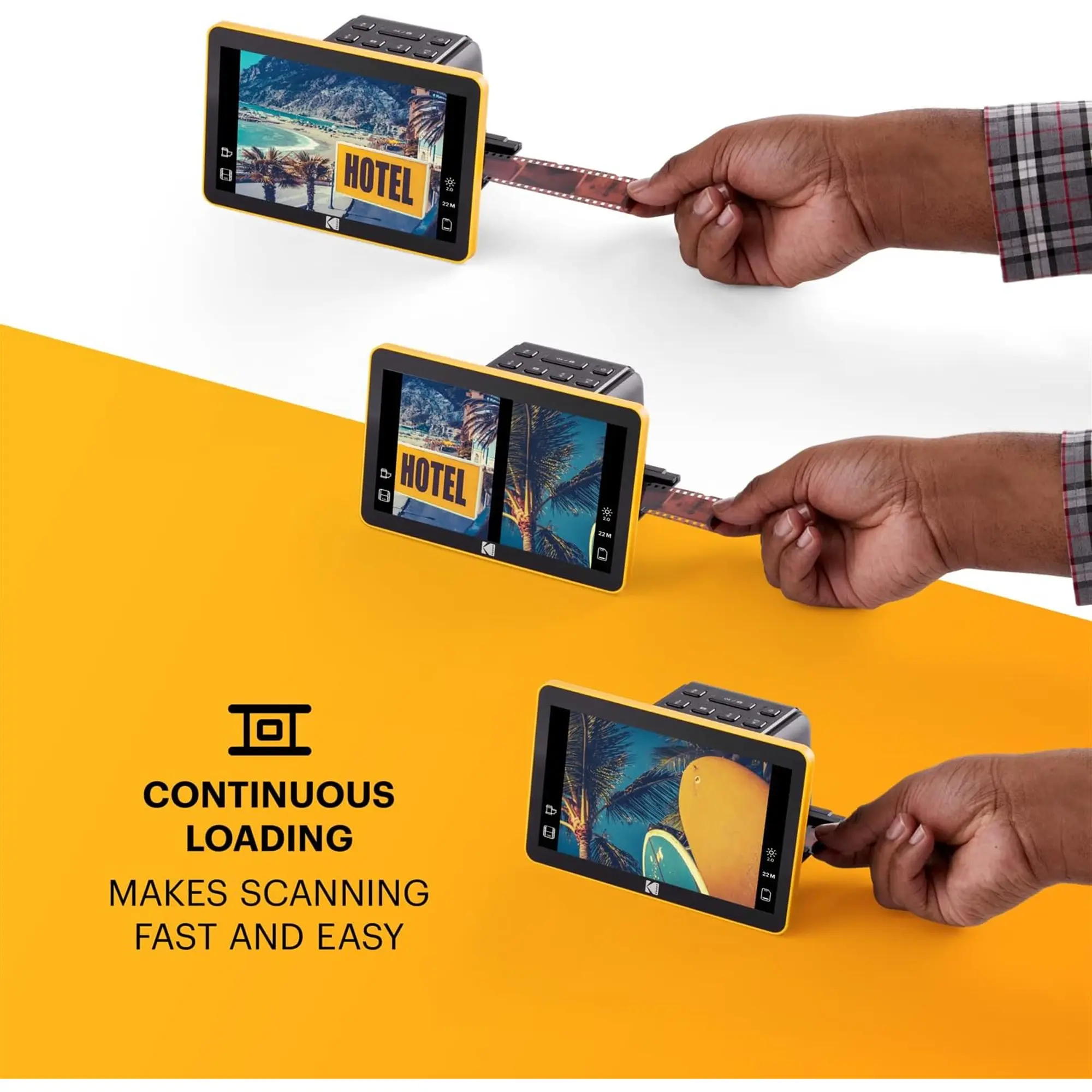 In addition to the main 50mm slide holder of the photo scanner for old photos to digital, three adapters are also provided for compatibility with 135, 110 and 126mm films. You can finally skip the stressful software and complicated onboard buttons—and simply scan with the Kodak Film Scanner and Slide Converter for old Slides to Digital!