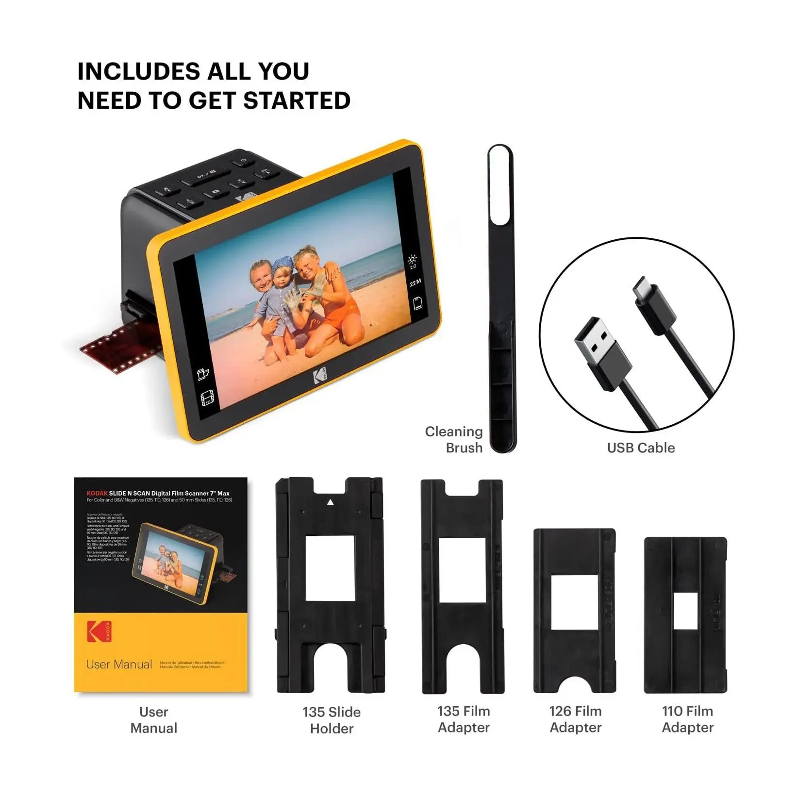 ·Includes Slide N Scan digital film scanner, 135 slide holder, 135 film adapter, 110 film adapter, 126 film adapter, USB cable, and cleaning brush