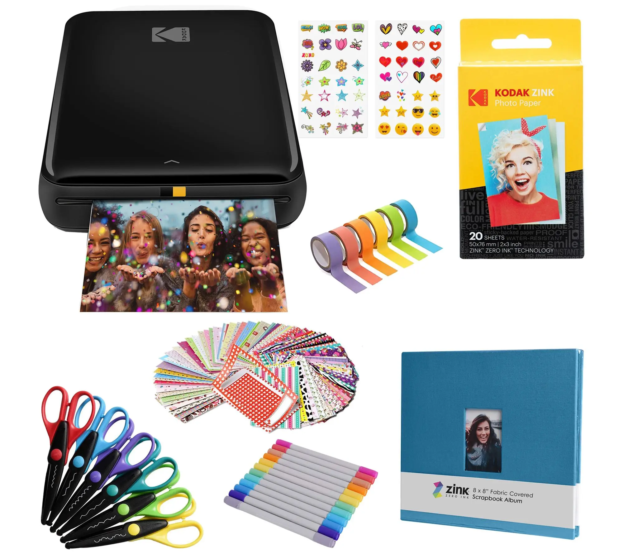 Capture life's moments as they happen with the Kodak Step Mobile Instant Photo Printer scrapbook bundle. This pocket-sized printer turns your smartphone snaps into vibrant, full-color photographs in less than a minute. Perfect for travelers, scrapbookers, or anyone who loves sharing memories, it uses Zink (zero ink) technology for hassle-free printing without the need for cartridges. Connect easily via Bluetooth to your iOS or Android device and start printing your favorite photos to share, stick, and enjoy! From Kodak.