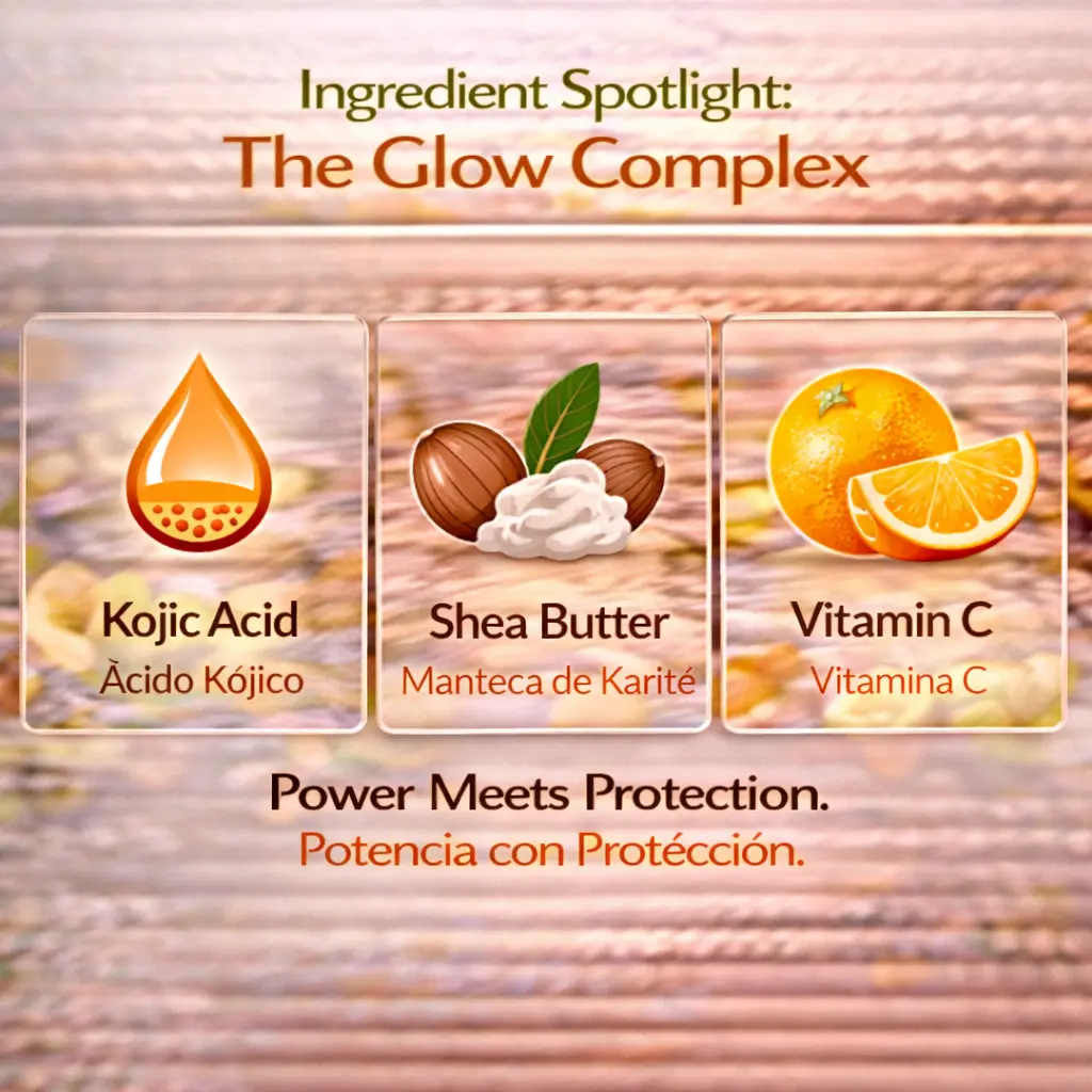 ADVANCED SKIN RADIANCE | LUMINOSIDAD AVANZADA — Formulated with high-purity Kojic Acid and Vitamin C to gently target dullness and support a more vibrant, even-looking complexion from head to toe. / Formulado con Ácido Kójico y Vitamina C para combatir la opacidad y apoyar una tez más vibrante y uniforme de pies a cabeza.