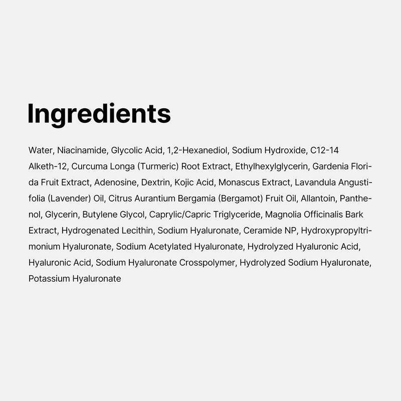 A potent blend of Kojic Acid, Turmeric, Glycolic Acid, and Niacinamide that works in harmony to exfoliate, smooth, and brighten overall skin tone—revealing a clearer, more radiant, glass-like complexion.