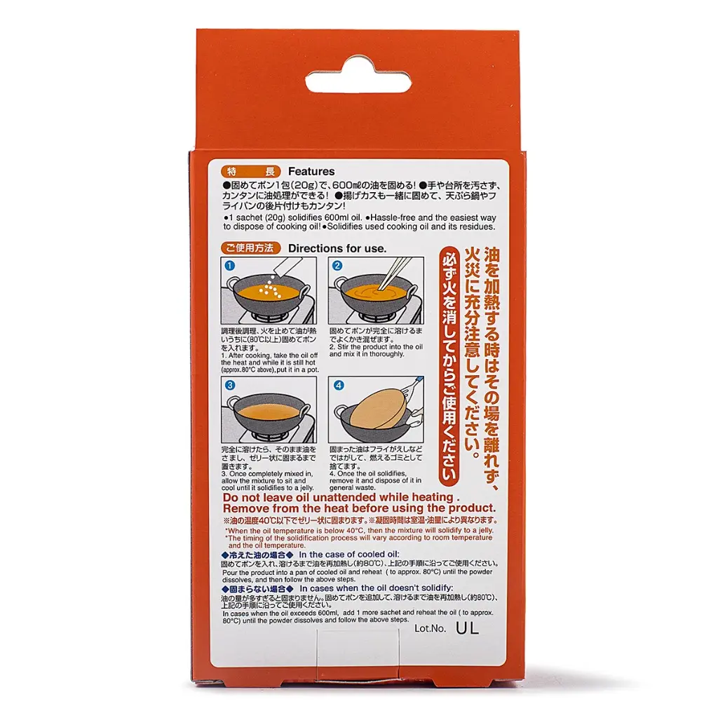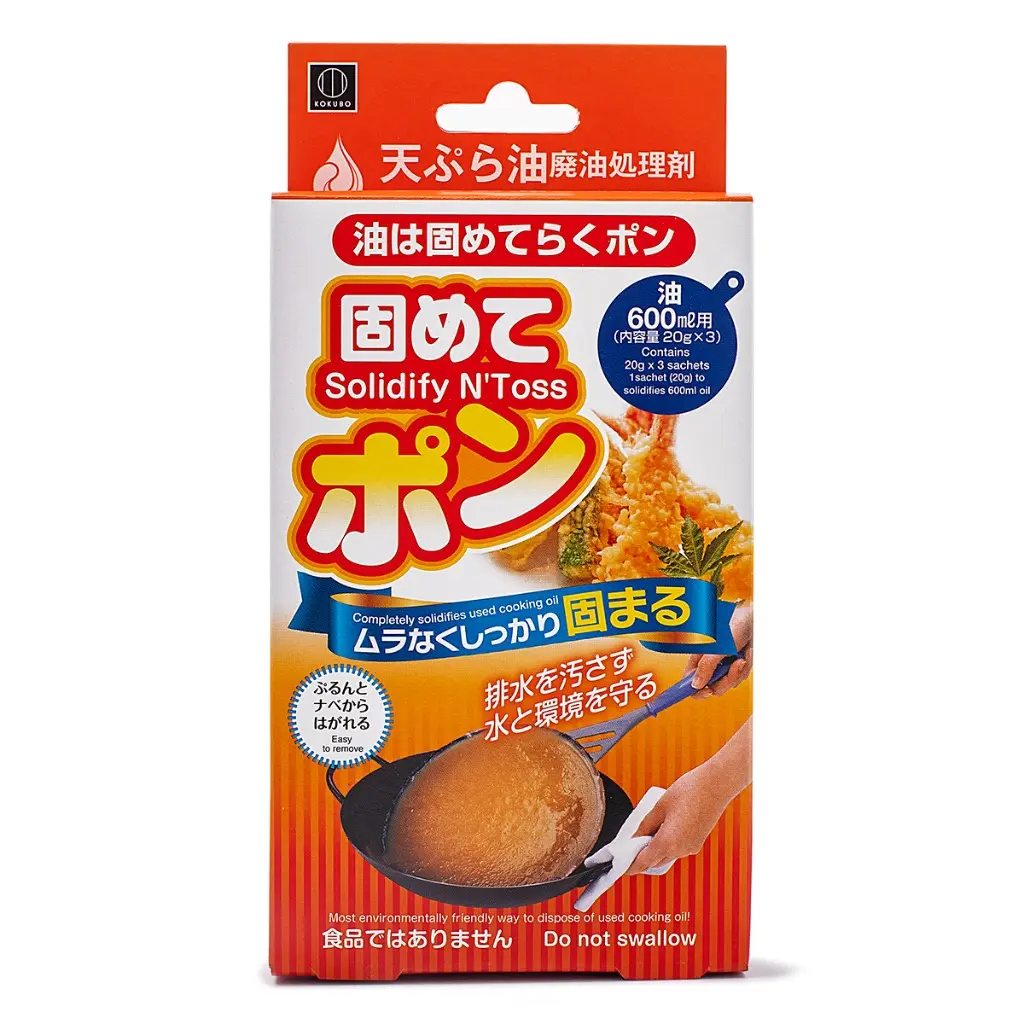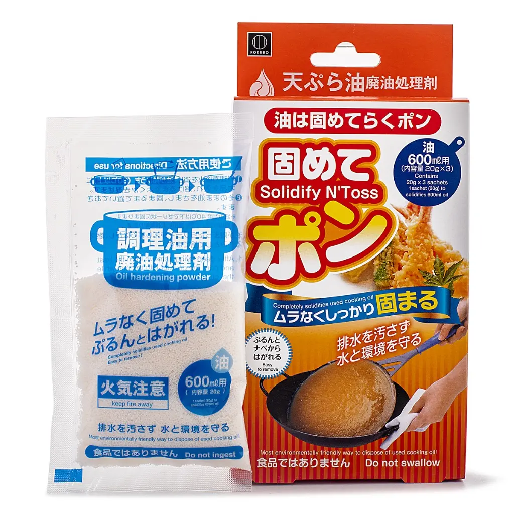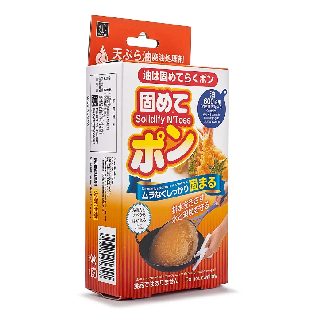Kokubo's Solidify 'N Toss Cooking Oil Solidifier makes cleaning up after deep-frying faster, safer, and cleaner. Each 20g packet turns up to 600ml of hot waste oil into a solid jelly-like mass that peels right off your pan — no stains, no stickiness, no fuss.