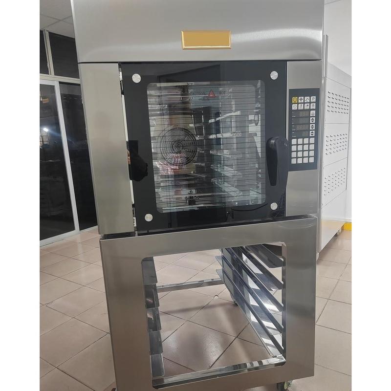 [ Machine Details ] Kolice commercial Hot Air Convectional Oven, 220V 60HZ, 9500W, 3 phase, temperature ranges from room temperature to 300℃, timer : 0-99 minutes, internal light, 5 trays, 228 kgs, comes with bottom frame, food grade stainless steel, whole dimension: 36.22”x49”x69.29” (92x124.5x176 cm), tray :15.74”x23.62” ( 40X60 cm ), adopts with high quality heating element system ,temper glass door, smart temperature controller with timer, efficient steam generation device included, high temperature resistant sealing strip for door