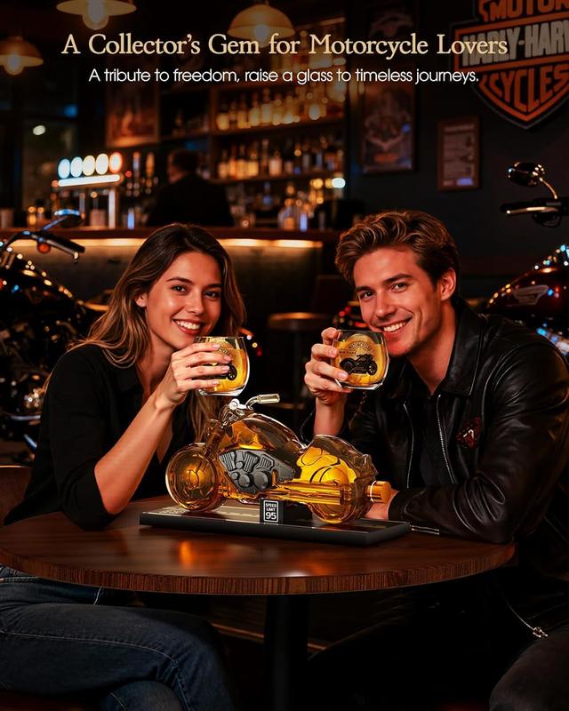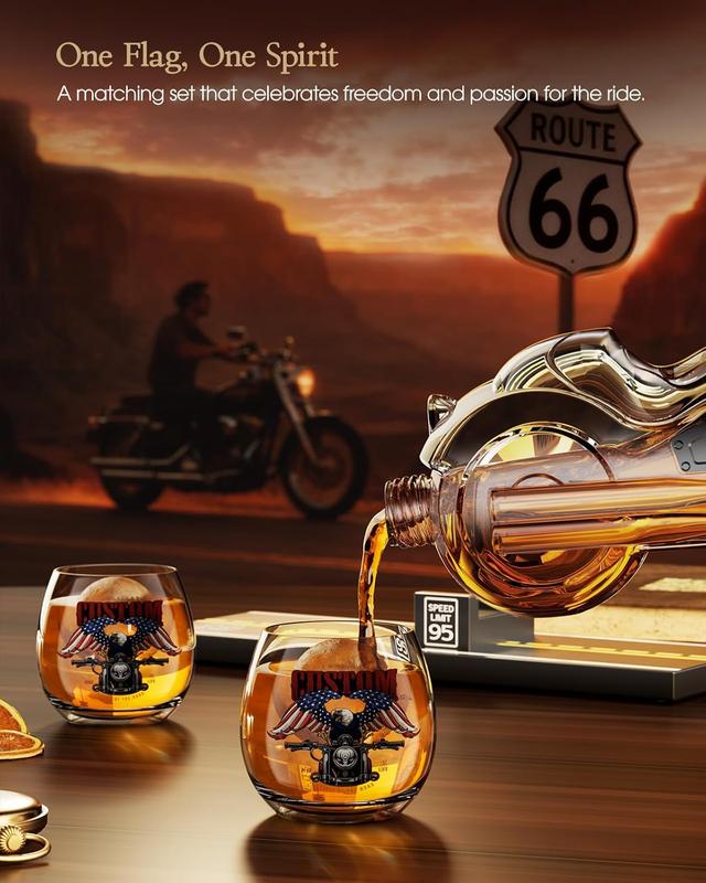 ·Iconic Design: Inspired by the open road, this Kollea Motorcycle Whiskey Decanter features a bold motorcycle body with American flag prints. It includes matching flag-printed glasses, a Route 66-style wooden base, and metal engine accents. 🏍️
