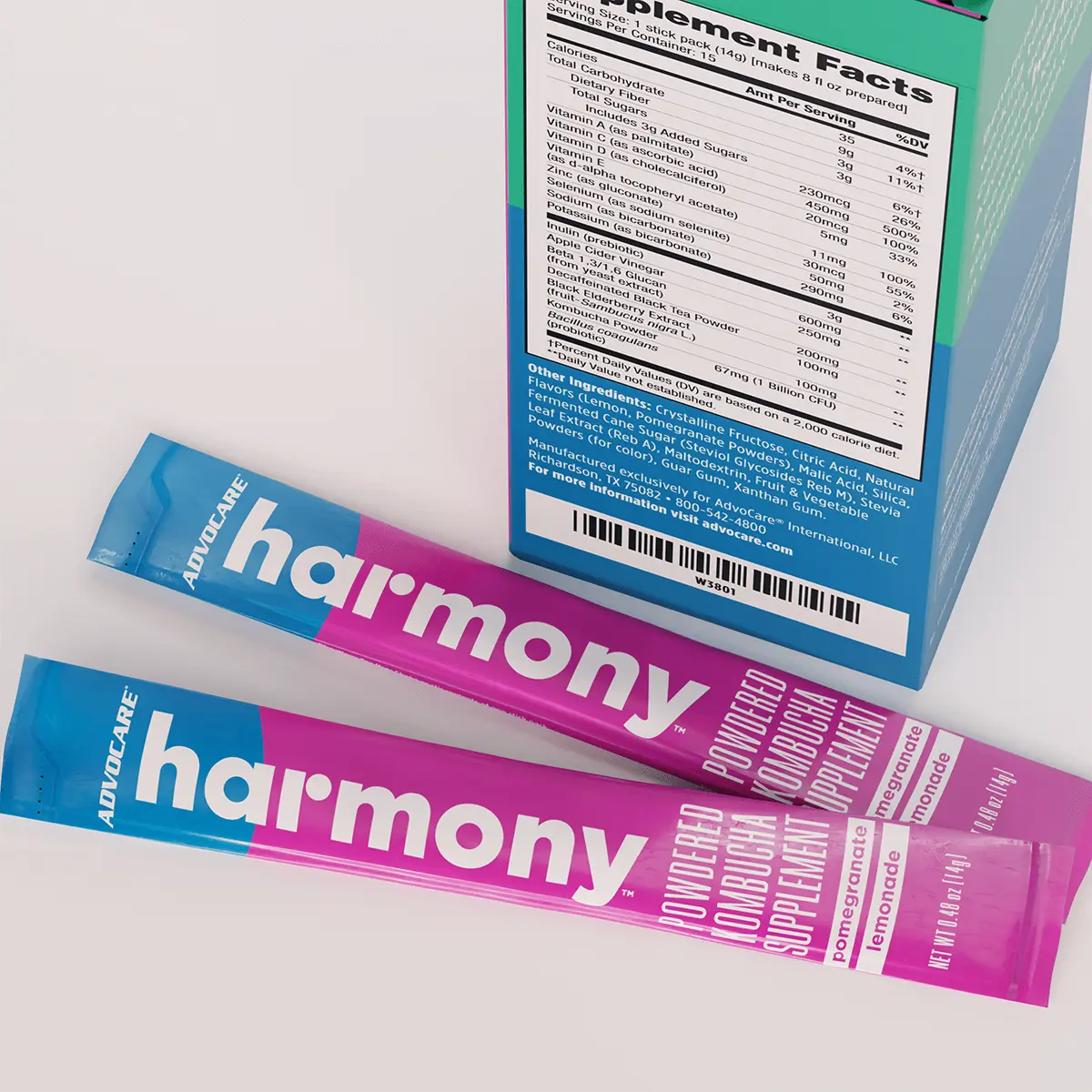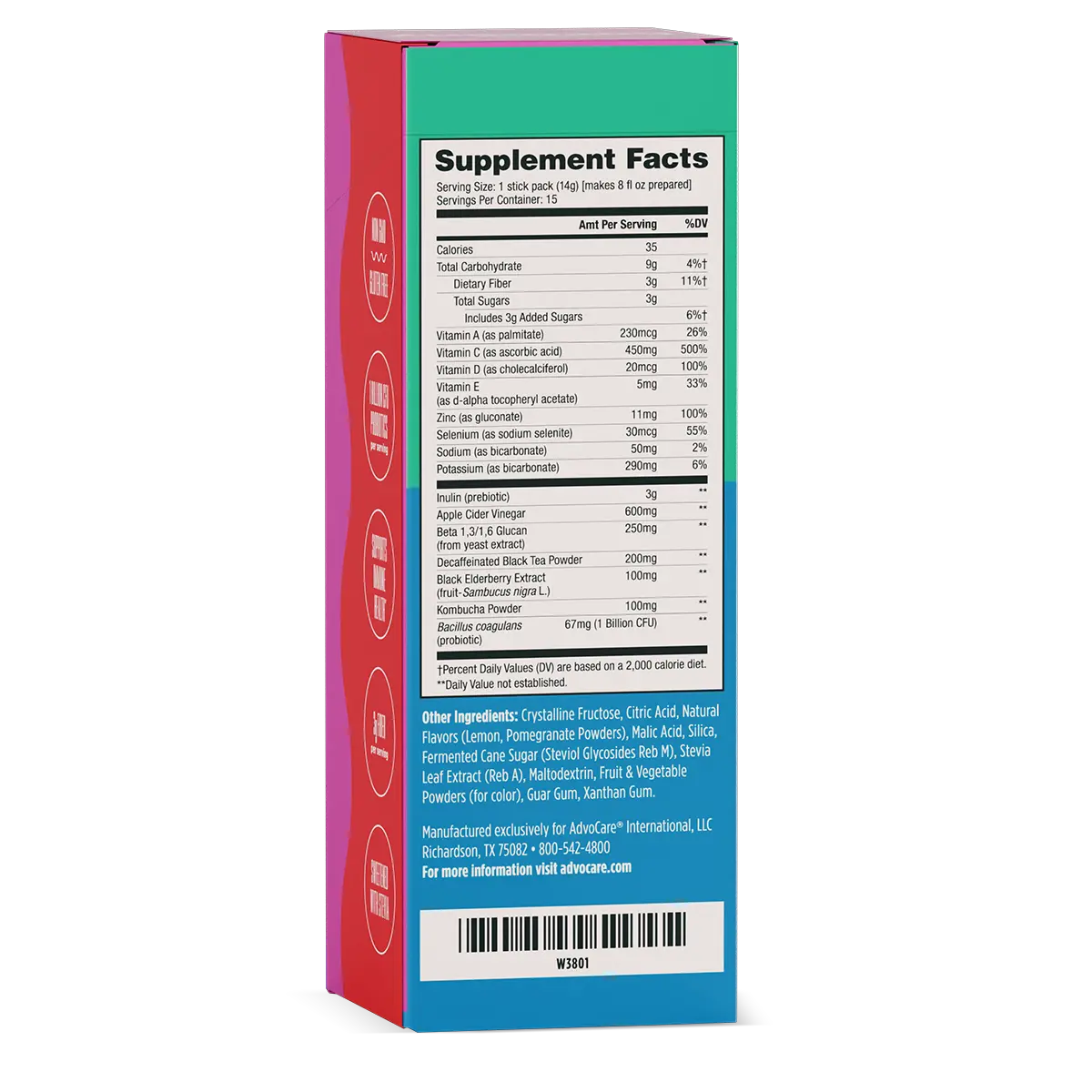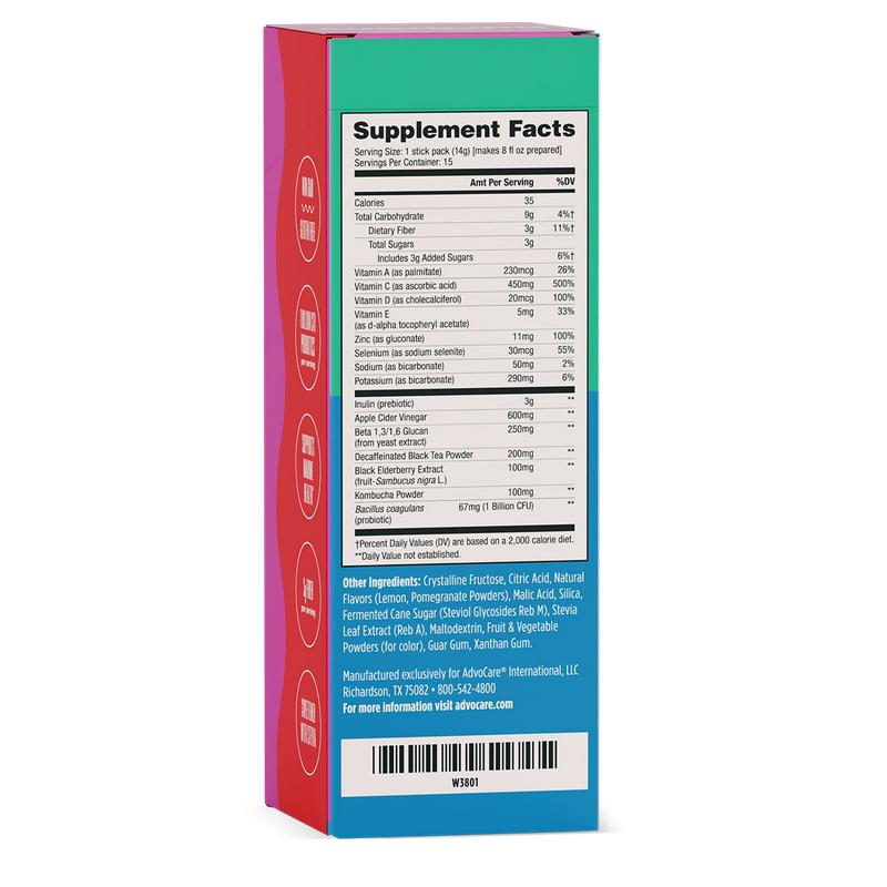 | Ingredients | Vitamin A (as palmitate), Vitamin C (as ascorbic acid), Vitamin D (as cholecalciferol), Vitamin E (as d-alpha tocopheryl acetate), Zinc (as gluconate), Selenium (as sodium selenite), Sodium (as bicarbonate), Potassium (as bicarbonate), Inulin (prebiotic), Apple Cider Vinegar, Beta 1,3/1,6 Glucan (from yeast extract), Decaffeinated Black Tea Powder, Black Elderberry Extract (fruit-Sambucus nigra L.), Kombucha Powder, Bacillus Coagulans (probiotic), Crystalline Fructose, Natural Flavors (Lemon, Pomegranate Powders), Citric Acid, Malic Acid, Silica, Fermented Sugarcane (Steviol Glycosides Reb M), Maltodextrin, Fruit and Vegetable Powders (for color), Stevia Leaf Extract Reb A 98%, Gar Gum, Xanthan Gum. |