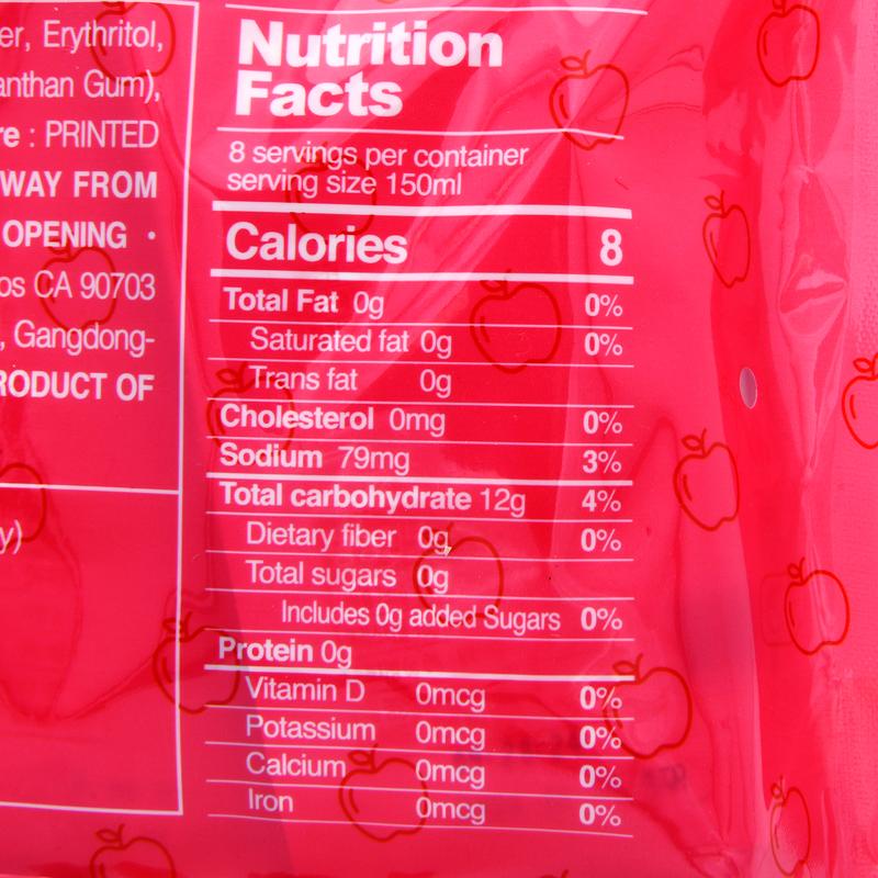 IngredientsPurified water, Erythritol,Mixture(Konjac powder, Carrageenan, Trisodium citrate, Dextrin, Gellan gum, Xanthan Gum)Apple flavor, Vitamin C, Apple concentrate, Citric acid, Sucralose.