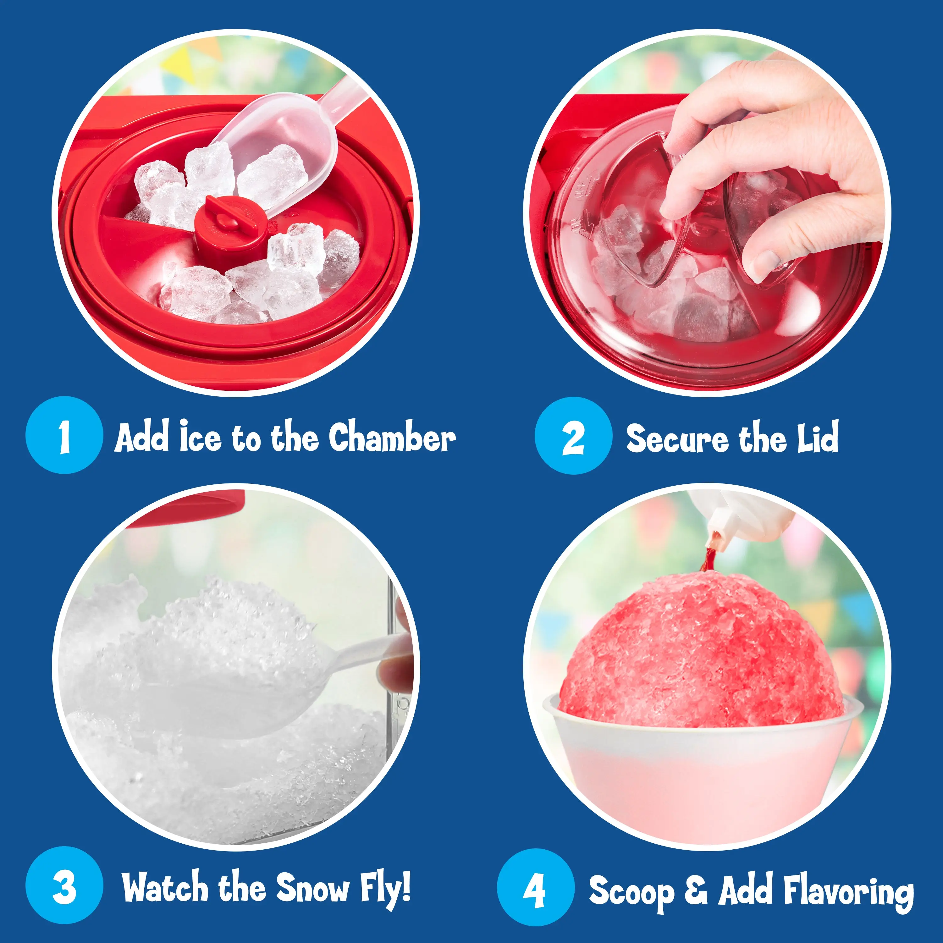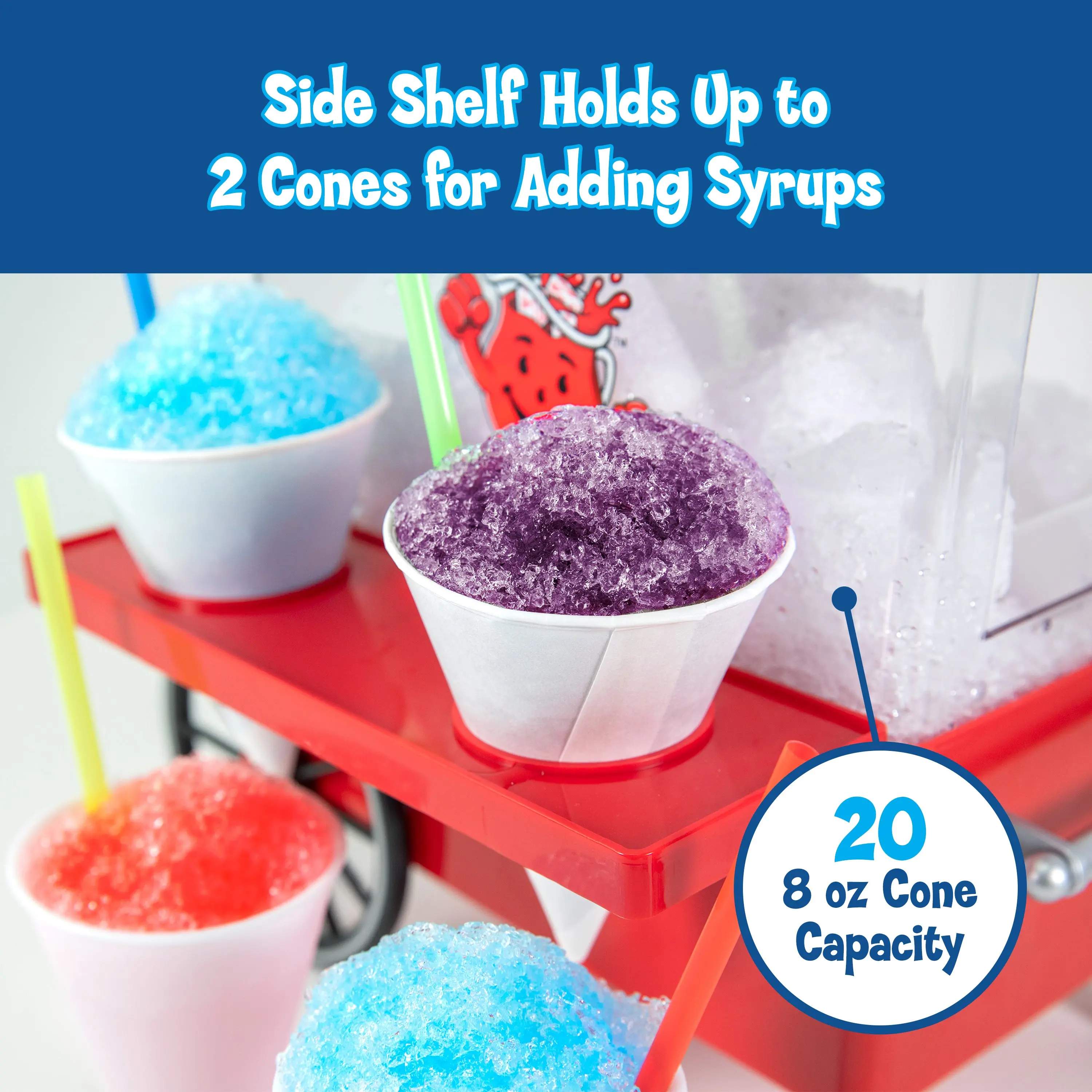 ·Use the side shelf as a prepping station to hold 2 snow cones and add your favorite syrups.