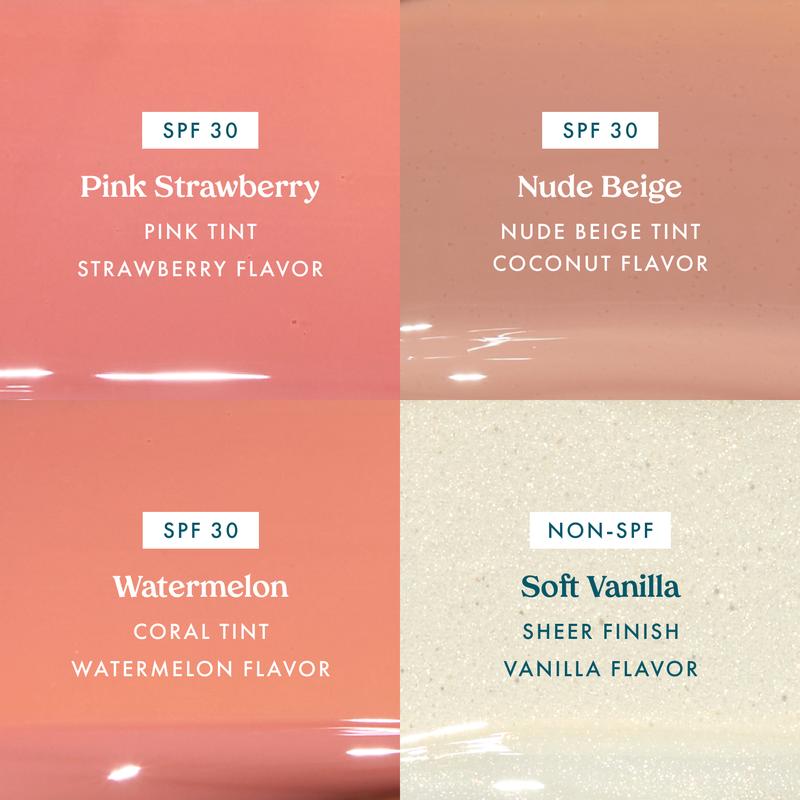 Pucker up for paradise. Lip Love wraps your lips in a soft swirl of moisture with a ceramide-led formula that hydrates, smooths, and protects. Available in four sheer, juicy shades - including three 100% mineral SPF 30 shades (Pink Strawberry, Watermelon, Nude Beige) and one non-SPF Soft Vanilla shimmer. No SPF taste, no sticky feel - just irresistibly soft, nourished lips that stay sweet all day.