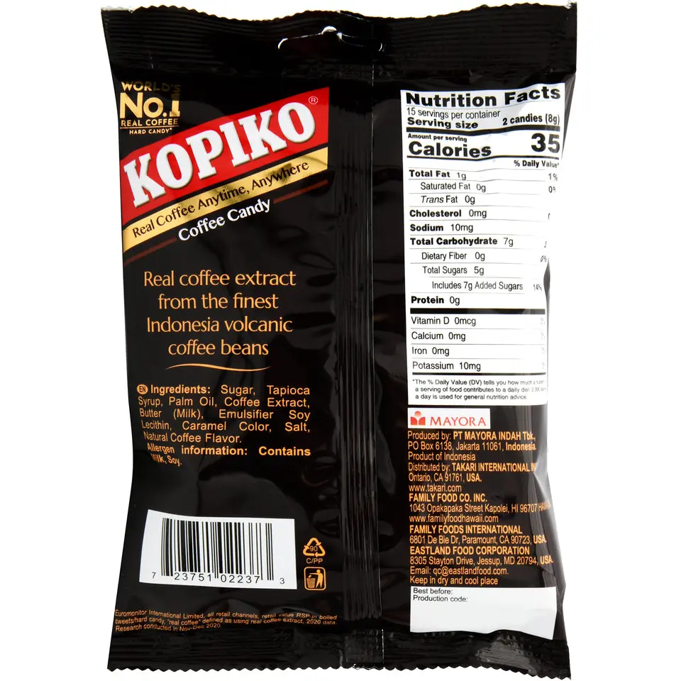 KOPIKO Coffee Candy Real Coffee Hard Candy is a delicious sweet snack made from real coffee extract, delivering the rich, bold taste of freshly brewed coffee in a convenient candy form. Each piece is packed with the authentic flavor and aroma of premium coffee beans, offering a smooth and satisfying treat for coffee lovers.