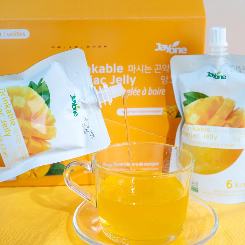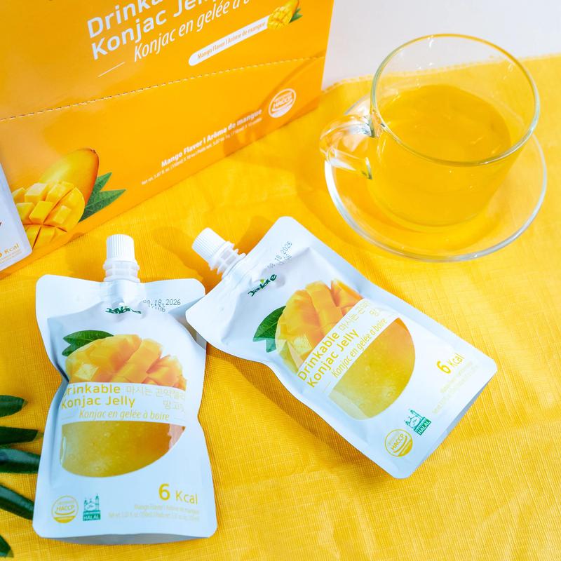 Experience the delicious taste of JAYONE's Korean Low-Calorie Konjac Jelly in refreshing mango flavor! With only 6 Kcal per pack, you can enjoy a sweet treat without the guilt.